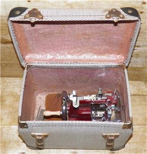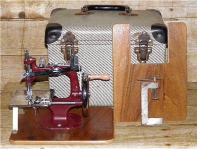 The machine comes complete with an oak bed extender, a table clamp for security while in use, and its original case black and white case with 2 cheney clasps.
