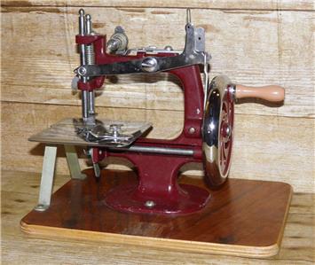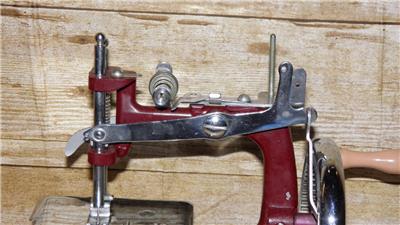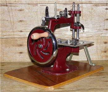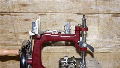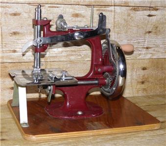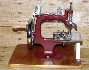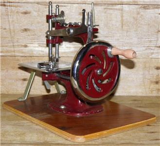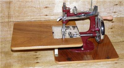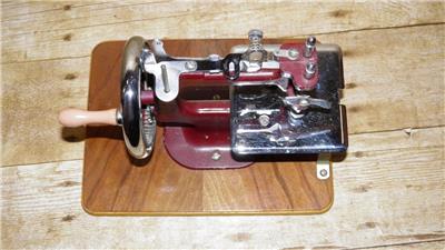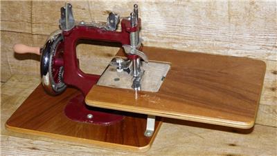 This is a vintage mechanical sewing machine, which is red in colour and sits on an oak board