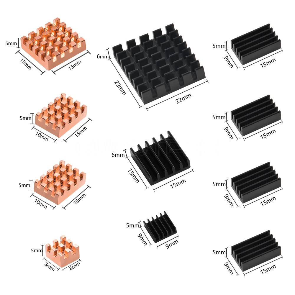 Multiple Heatsinks: The heatsink set typically includes multiple individual heatsinks designed to fit specific components on the Orange Pi board. These may include heatsinks for the CPU, GPU, RAM, or other heat-generating elements.