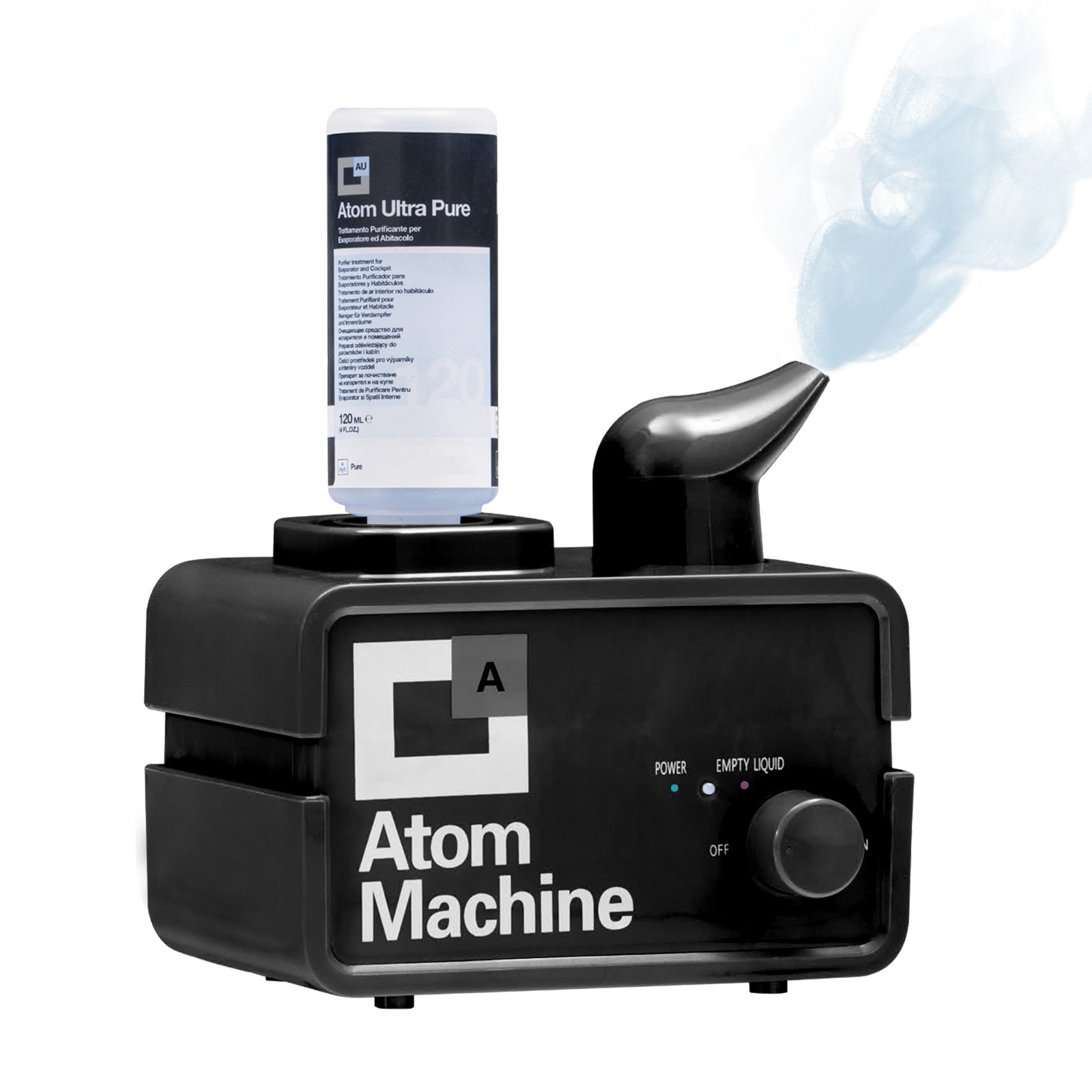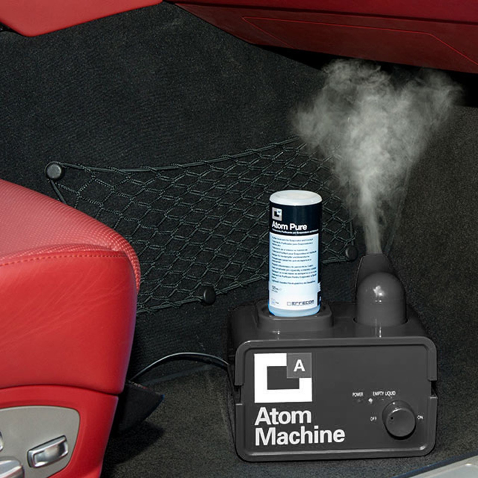 Die ATOM MACHINE ist ein elektronisches Ultraschallgerät, welches eine antibakterielle Flüssigkeit (U/S Clean) zerstäubt, um es über das Umluftsystem des Fahrzeuges zu verteilen.