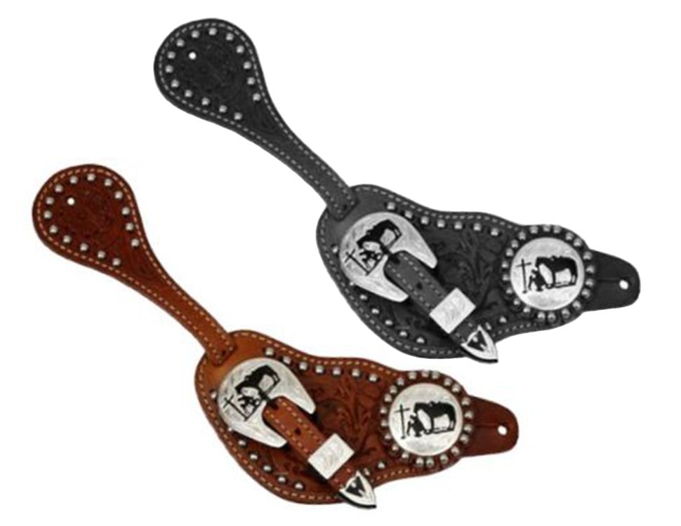Showman men's size floral tooled leather spur straps. These spur straps are accented with small silver beads and feature silver engraved praying cowboy conchos and buckles. Sold in pairs. Available in Medium Oil and Black leather.