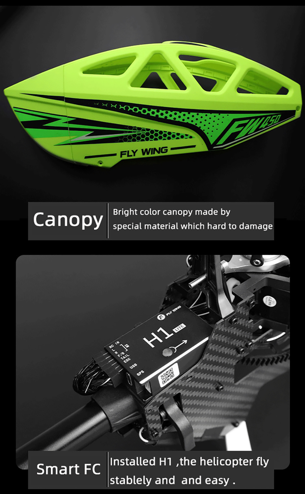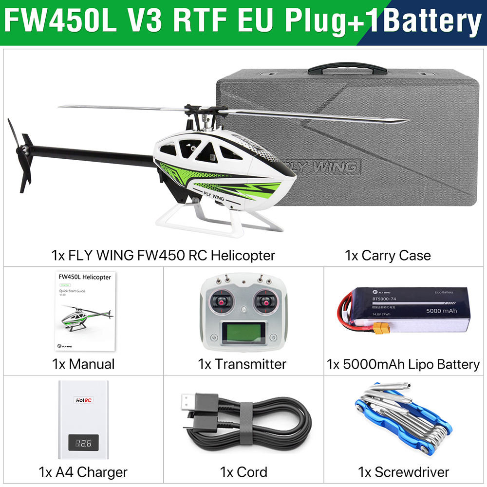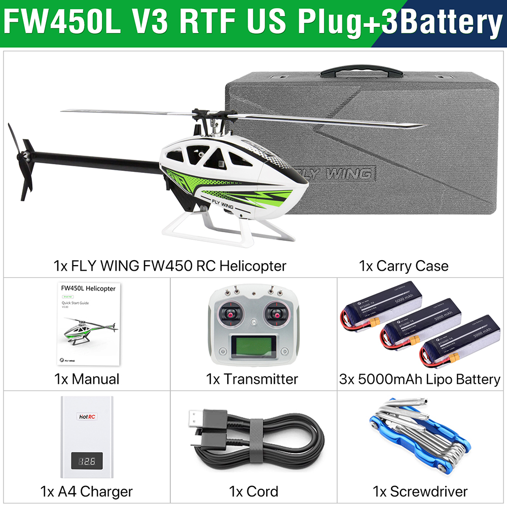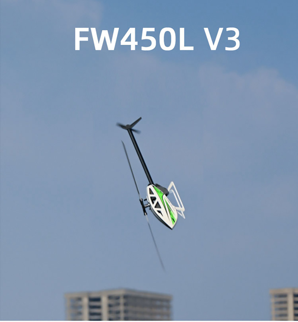 Say hello to the most Ready-to-fly RC helicopter ever! Fly Wing FW450L V3 introduces you to an entirely new RC helicopter experience! It is the worlds first RC helicopter that supports auto-aerobatic flight.With a high-power motor, OMNI-GPS, and one-key return function, it ensures you enjoy astable and safe flight experience while having lots of fun