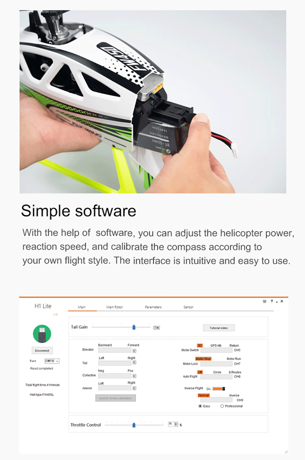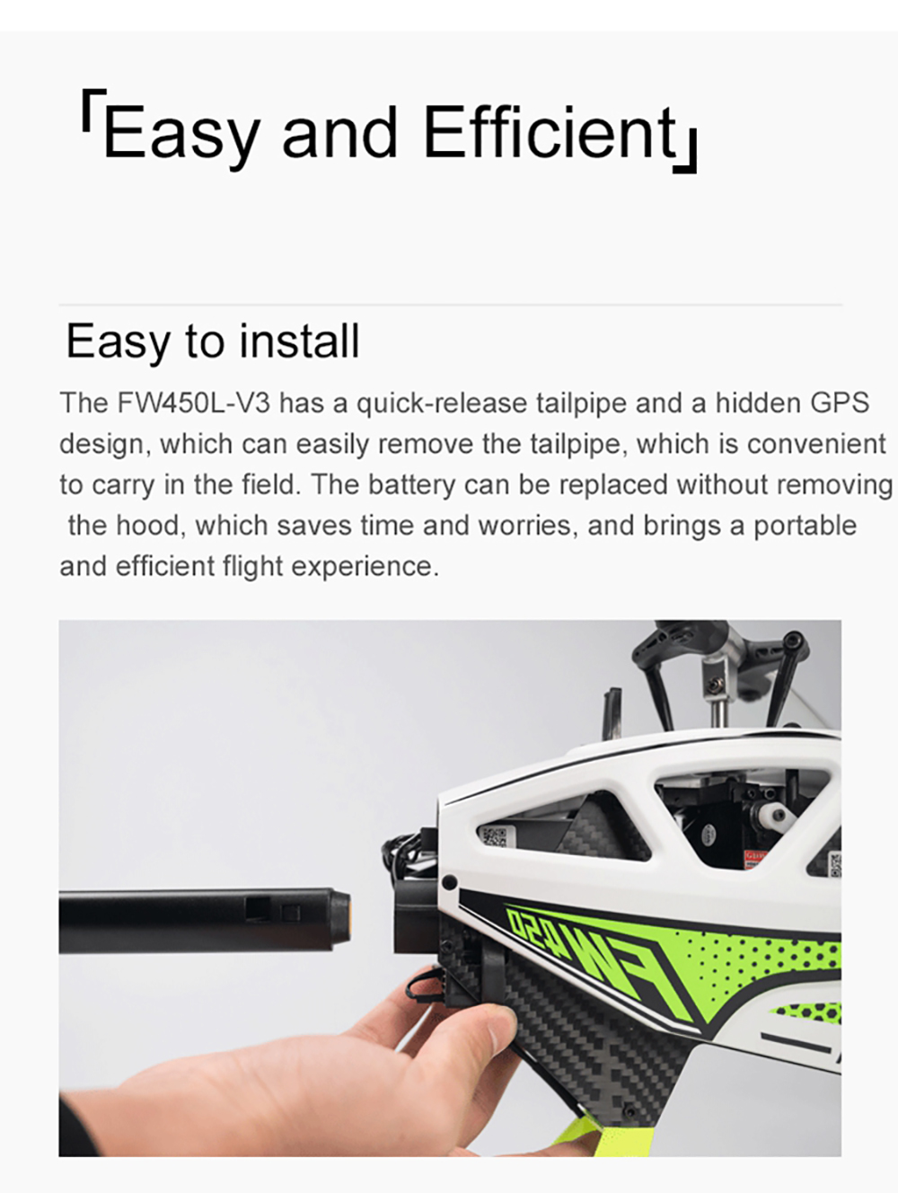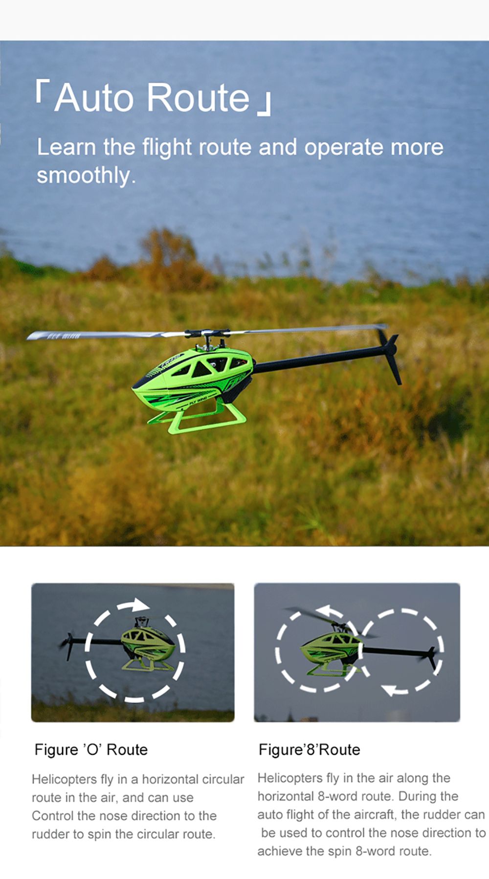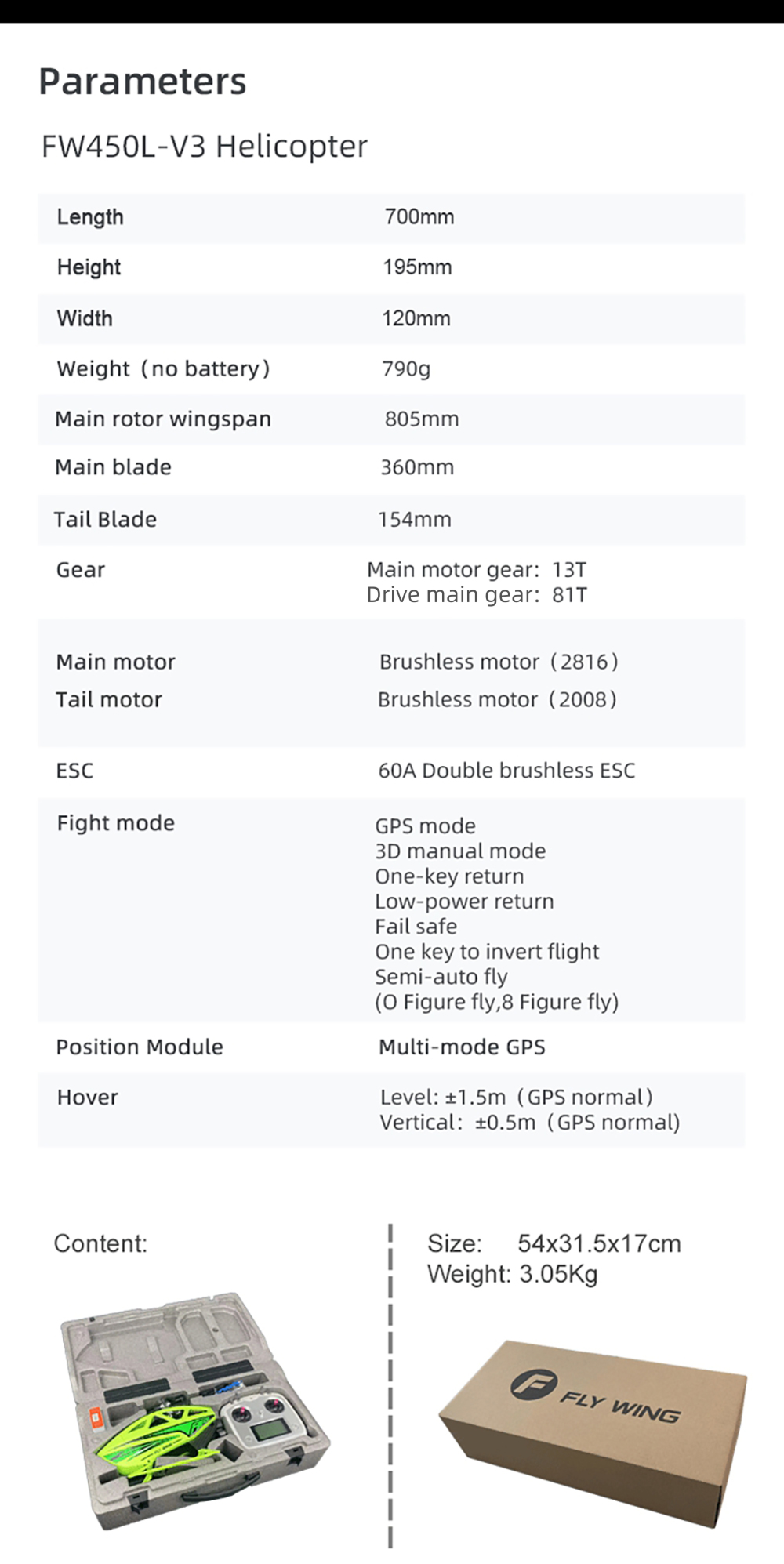 Say hello to the most Ready-to-fly RC helicopter ever! Fly Wing FW450L V3 introduces you to an entirely new RC helicopter experience! It is the worlds first RC helicopter that supports auto-aerobatic flight.With a high-power motor, OMNI-GPS, and one-key return function, it ensures you enjoy astable and safe flight experience while having lots of fun