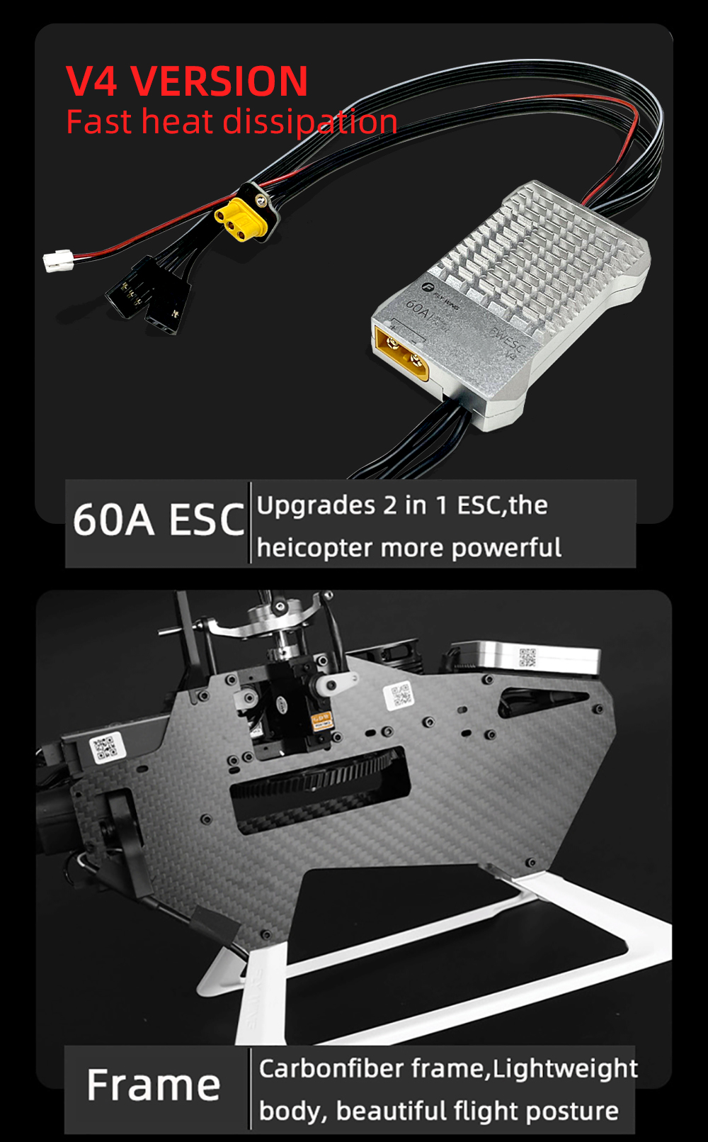 1.Hobby RC Helicopters: 6CH, FBL 3D Fying design RC helicopter for adults.Using 700 class helicopter al-metal rotor brushless 5mm shaft tail motor, high speed and sensitive response .All metal main gear, 18mm 3k carbon fiber tail boom, with 2816 poweful brushless main motor