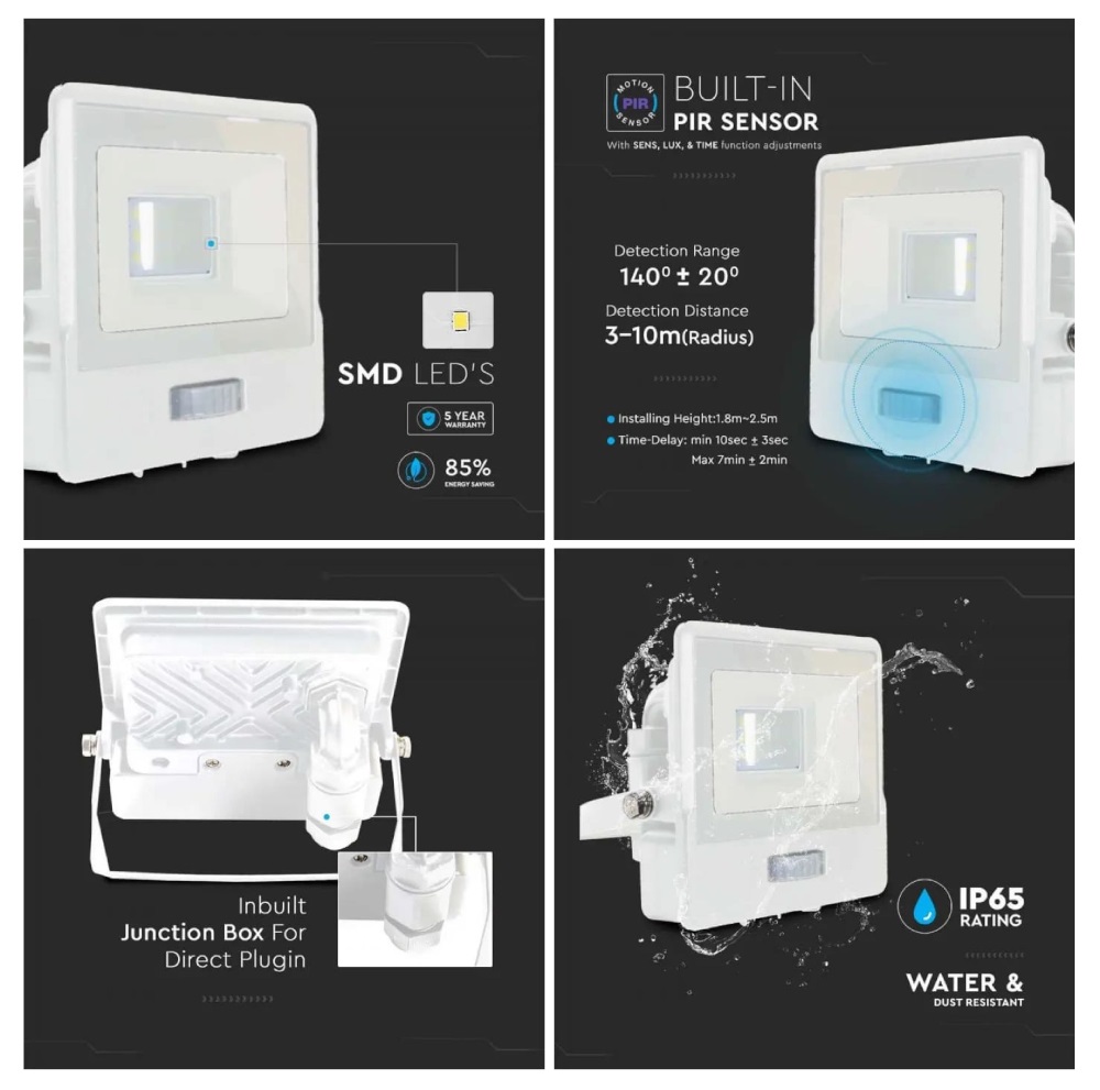 V-Tac VT-138S è un faro LED da 30W di potenza con tecnologia LED Samsung SMD, corpo in alluminio di colore bianco e copertura satinata. Con fascio luminoso di 100° e flusso luminoso di 2340 lm, questo faro ha un rapporto di 78 lm/W. Inoltre, ha un grado di protezione IP65 che lo rende adatto ad un uso esterno, anche sotto la pioggia prolungata. È predisposto per il fissaggio a parete, ed il collegamento alla rete elettrica avviene tramite morsetti a vite direttamente all'interno della pratica scatola di derivazione impermeabile incorporata.
