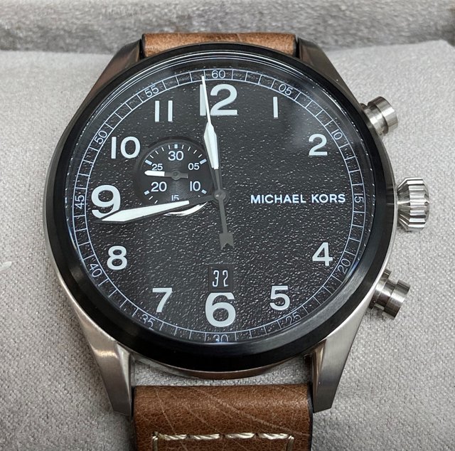 Watch Information: Gender: Men's Case Size: 45mm Dial Color: Black Material Case: Stainless Steel Material Band: Leather Diamonds: n/a Movement: Analog Quartz Water Resist: 30M Features: Water Resistant, Date, Chronograph Clasp/Buckle: Pin Buckle Additional Info: Packaging: Michael Kors Box & Papers