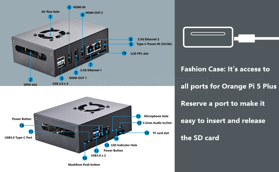 Optimized Cooling System: Equipped with a high-performance yet low-noise cooling fan and premium thermal conductive adhesive heatsinks, this case ensures efficient heat dissipation to prevent performance throttling and extend the lifespan of your Orange Pi 5 Plus.