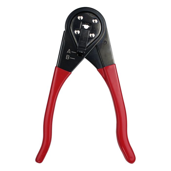To adjust tool for various fittings: set latch to position A for splice caps and lugs. Set latch to position B for larger caps.