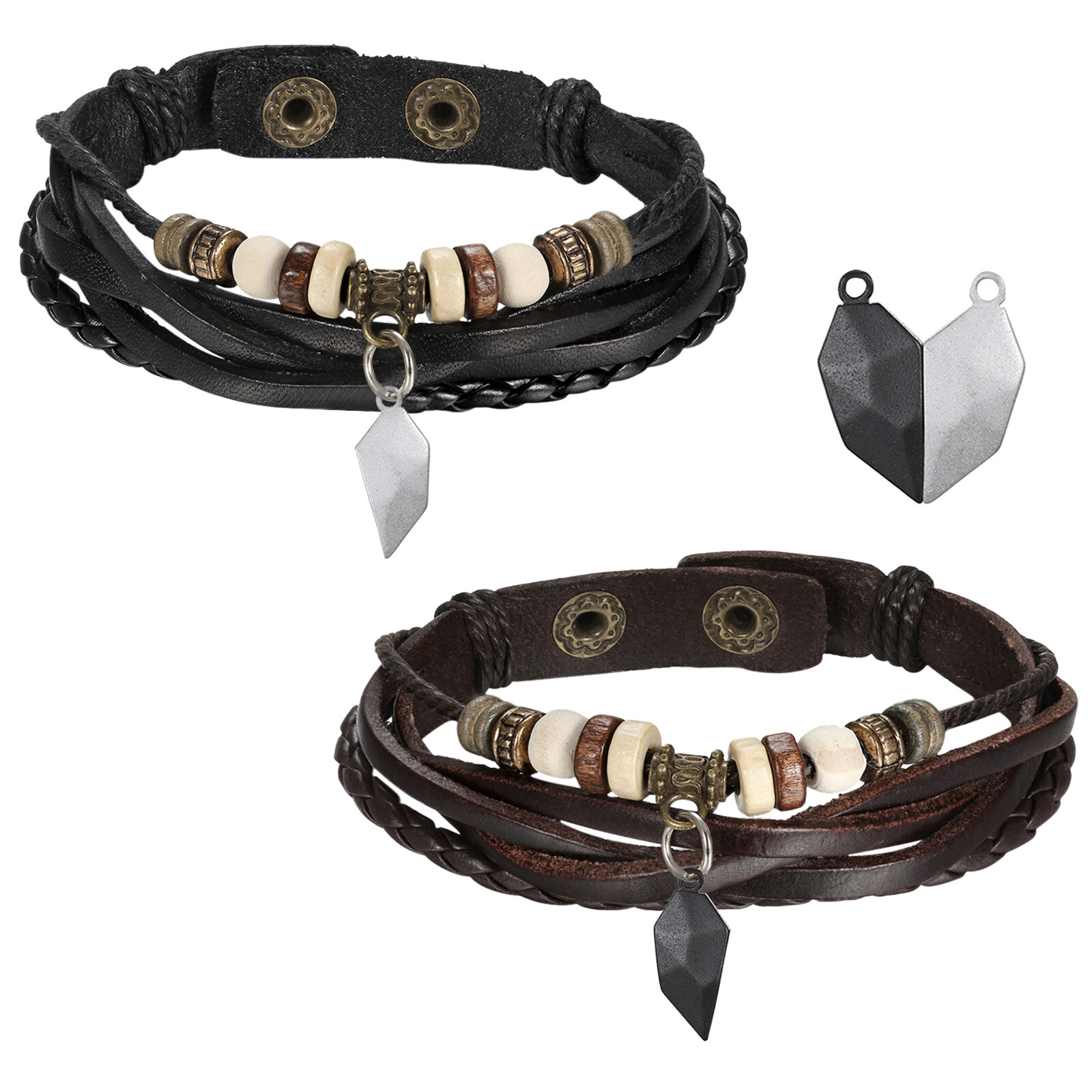 2pcs Retro Couples Beaded Magnetic Love Heart Matching Leather Bracelet Gift