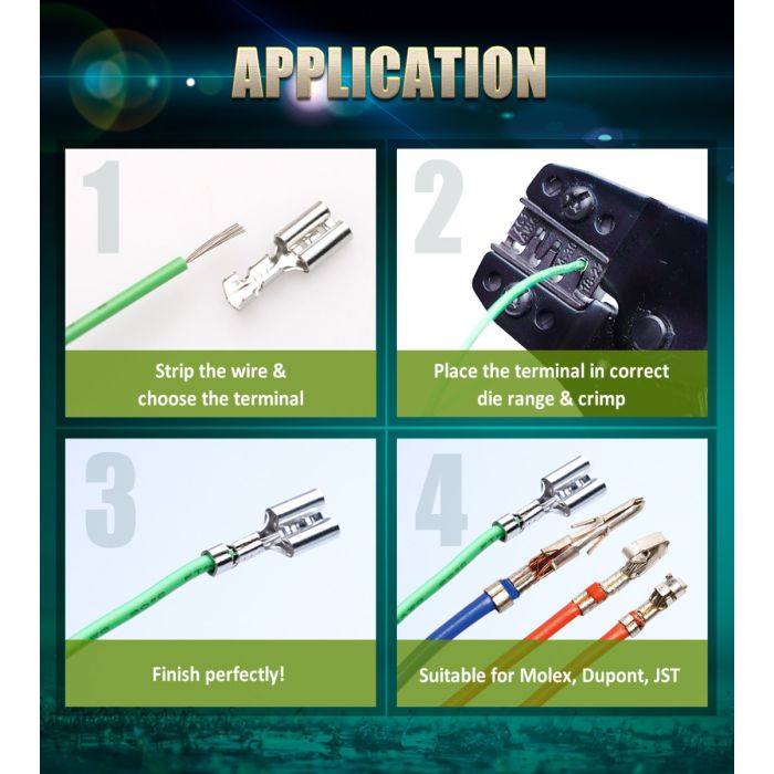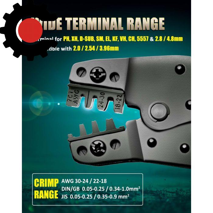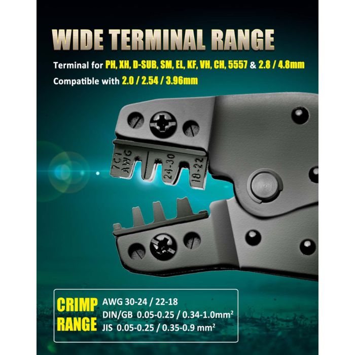 Compatible with 2.0, 2.54, 3.96mm open barrel terminals including PH, XH, D-SUB, SM, EL, KF, VH, CH, 5557, also compatible with 2.8, 4.8mm Non-insulated open barrel terminals.