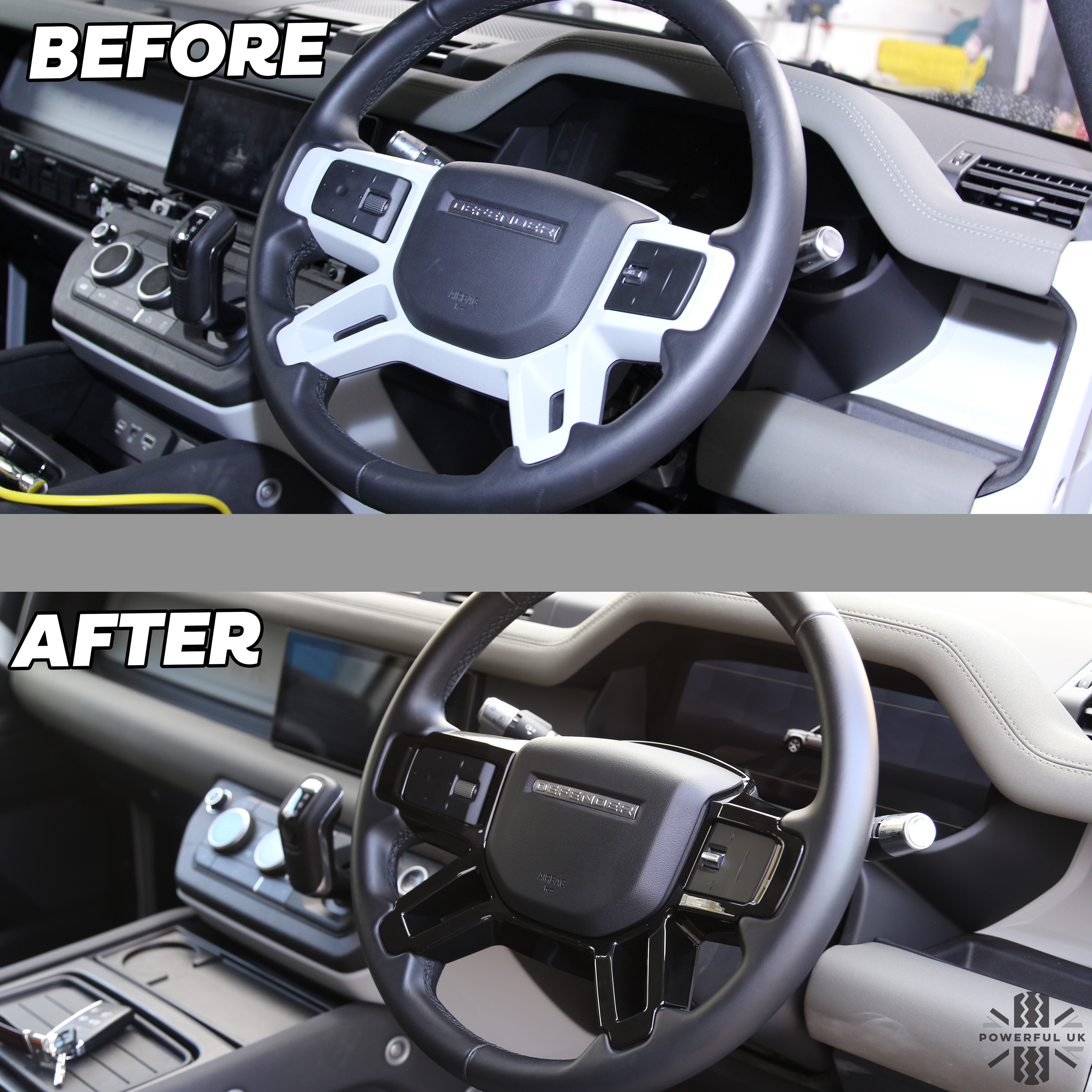 The standard steering wheel finisher comes in white or light grey but the top-of-the-range Defender X models have a darked black/dark grey steering wheel.