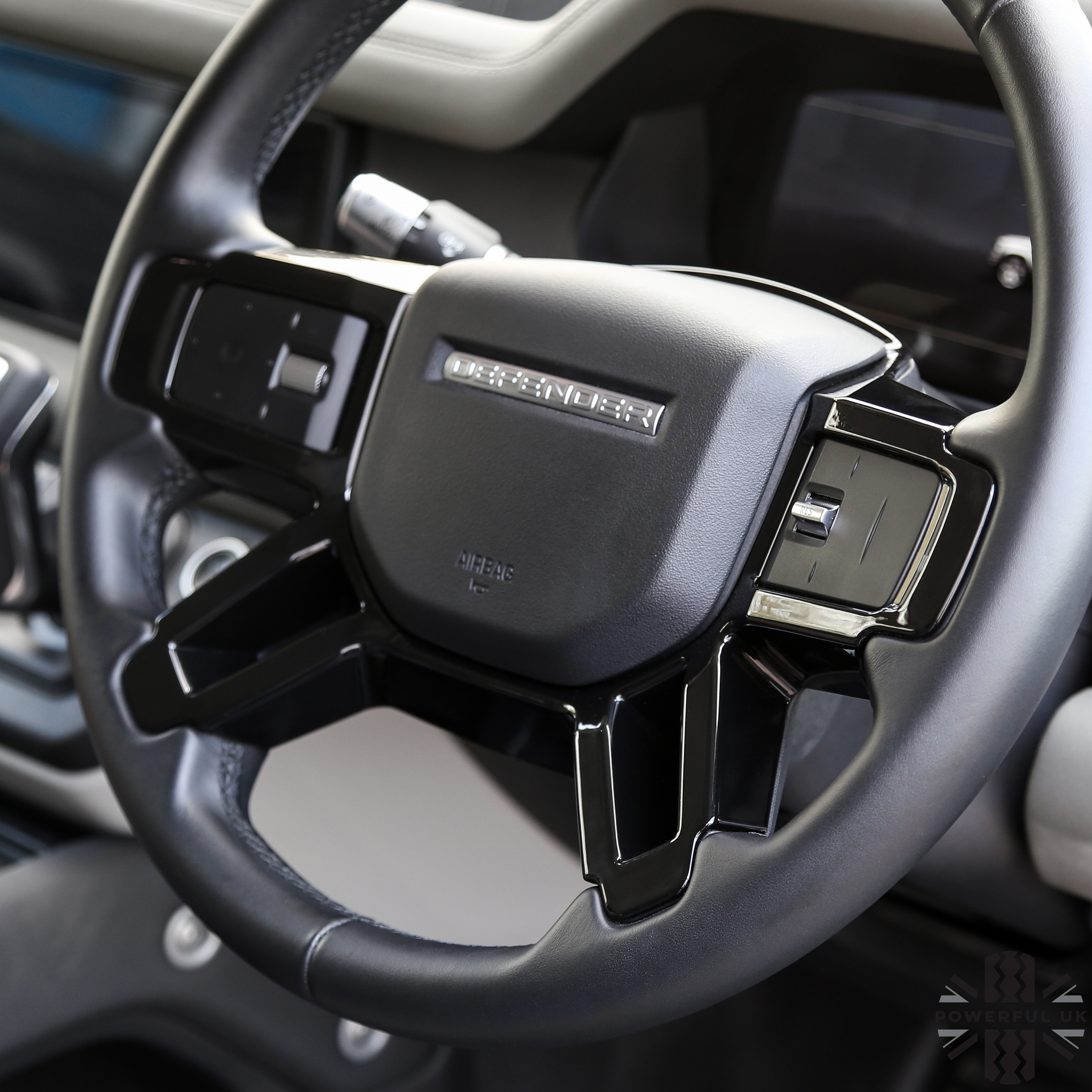This listing is for a gloss black steering wheel spoke cover for the Land Rover Defender L663.