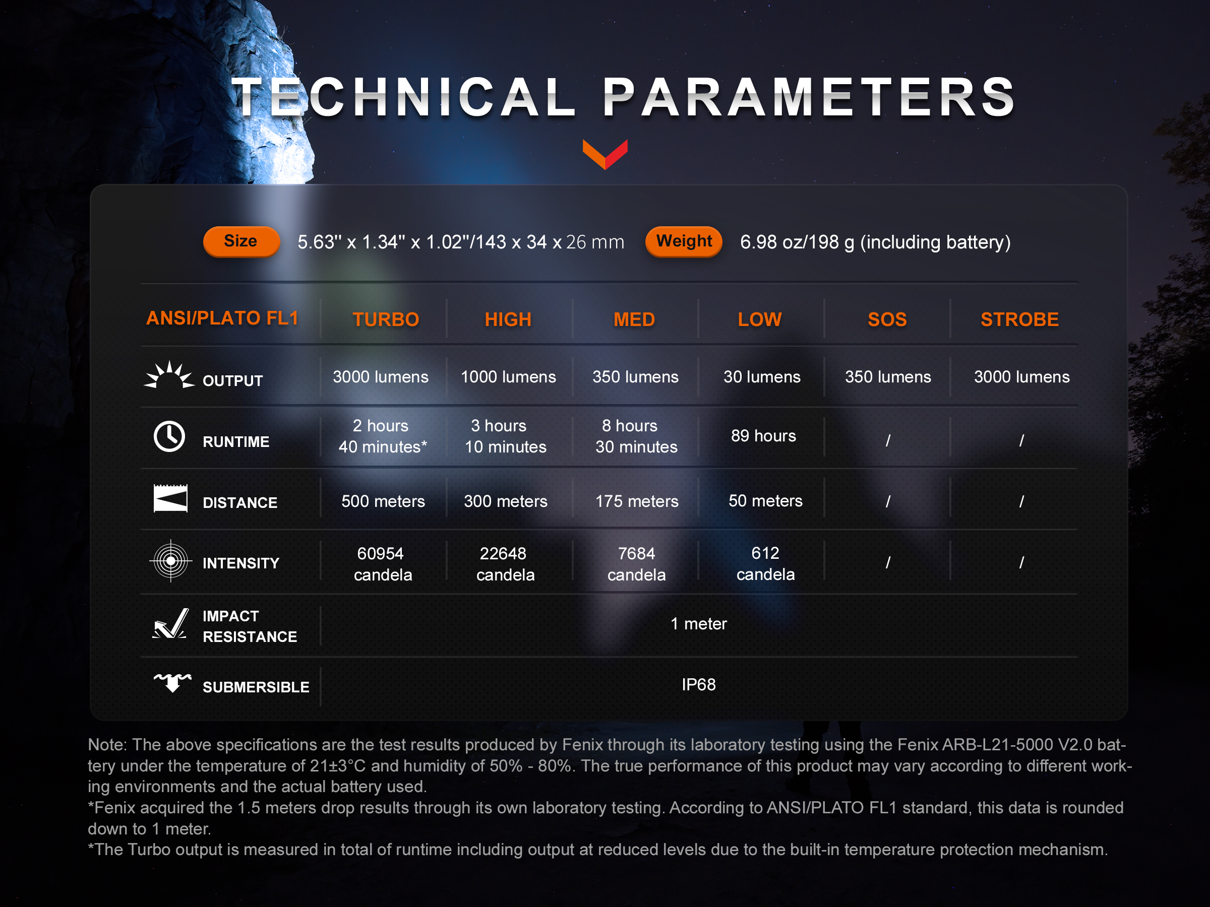 | Turbo | 3000 lumens | 2 hrs 40 mins |