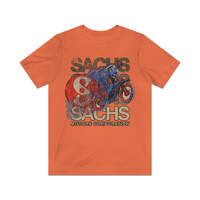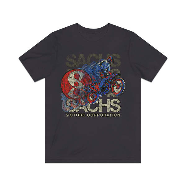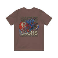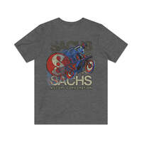 Description Sachs Motors Corporation of Germany began making motorcycles in 1886, making them one of the world's oldest motorcycle manufacturers. They also designed and engineered their own engines, supplying them to manufacturers around the world. While their previous offerings had primarily been road going cycles and scooters, in 1968 they threw their hat into the popular motocross segment with an all new competition dirt bike. Although their 125 MX model was designed for motocross racing, the bike proved to be readily adaptable and an ideal trail bike for the enthusiastic novice. They quickly followed up the success of their 125 MX with a larger 250 model, and between the two, Sachs began winning off-road races – lots of off-road races – much to the surprise of the makers that had been dominating the field. Details Like all our designs, this one is treated with our signature ‘relic-ing’ process which includes our own secret recipe of hand-painted chipping, cracking, fading, and just the right touch of yellowing to ensure that it looks the part of a true vintage imprint.** We lay these works of art down on premium Bella+Canvas 3001 Unisex Jersey Short Sleeve Tees, one of the softest, best-wearing t-shirts available today, via state of the art direct to garment (DTG) printing which allows us to create a vintage effect that simply can’t be accomplished with other printing methods. In short, these shirts are everything you’ve dreamed of and more – it feels soft and lightweight with just the right amount of stretch making it comfortable and flattering for both men and women. 100% combed and ring-spun cotton* Fabric weight: 4.2 oz (142 g/m2) 30 single Tear-away label Shoulder-to-shoulder taping Side-seamed Retail fit Runs true to size Sizing Not sure what size is your best fit? We recommend taking one of your current t-shirts, laying it flat and measuring it. The measurements in the chart below are taken with the shirt laying on a flat surface. To get the length, measure from the high shoulder point down to the bottom of the shirt. To get the width, measure approximately 1-inch below the armhole, across the chest, from seam to seam. While our tees are all made using premium, pre-shrunk, ring-spun cotton, there can be some shrinkage depending on your personal wash and dry cycles. With that said, if you're on the fence, we always suggest going up a size. S M L XL 2XL 3XL Width 18 20 22.01 24.02 25.99 28 Length 28 29.02 30 31.03 32.01 33 Sleeves 8.9 9.18 9.45 9.73 10 10.4 All sizes are provided in inches! *Heather colors are 52% combed and ring-spun cotton/48% polyester. Athletic and Black Heather is 90% combed and ring-spun cotton/10% polyester. Ash color is 99% Airlume combed and ring-spun cotton and 1% poly. **Due to the nature of the printing process and different sizes of shirts offered, imprint position and scale may vary slightly from the product images, but we do our best to be as accurate as possible.