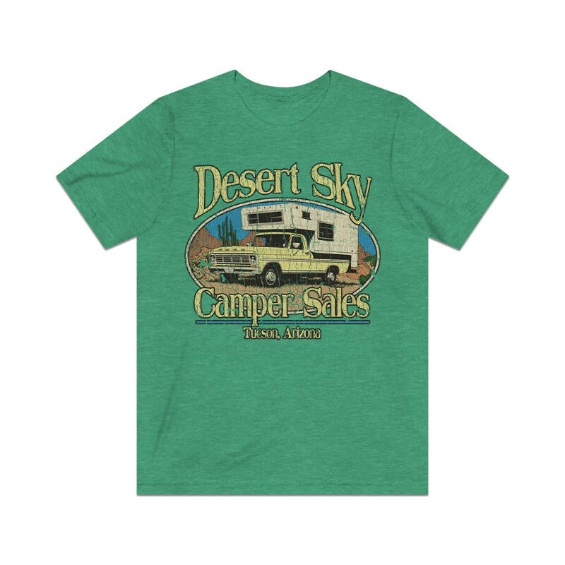 Desert Sky Camper Sales of Tucson has it all - 5th wheels, slide-ins, travel trailers, and more, and all at ridiculously low prices! Featuring a vintage Ford F-100 pickup truck with a slide-in camper chillin' at a desert campsite, this one is all about that 1970s giveaway promo t-shirt vibe.