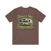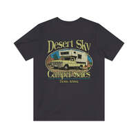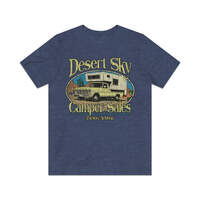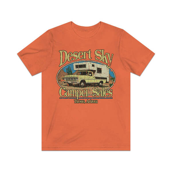 Description Desert Sky Camper Sales of Tucson has it all - 5th wheels, slide-ins, travel trailers, and more, and all at ridiculously low prices! Featuring a vintage Ford F-100 pickup truck with a slide-in camper chillin' at a desert campsite, this one is all about that 1970s giveaway promo t-shirt vibe. Details Like all our designs, this one is treated with our signature ‘relic-ing’ process which includes our own secret recipe of hand-painted chipping, cracking, fading, and just the right touch of yellowing to ensure that it looks the part of a true vintage imprint.** We lay these works of art down on premium Bella+Canvas 3001 Unisex Jersey Short Sleeve Tees, one of the softest, best-wearing t-shirts available today, via state of the art direct to garment (DTG) printing which allows us to create a vintage effect that simply can’t be accomplished with other printing methods. In short, these shirts are everything you’ve dreamed of and more – it feels soft and lightweight with just the right amount of stretch making it comfortable and flattering for both men and women. 100% combed and ring-spun cotton* Fabric weight: 4.2 oz (142 g/m2) 30 single Tear-away label Shoulder-to-shoulder taping Side-seamed Retail fit Runs true to size Sizing Not sure what size is your best fit? We recommend taking one of your current t-shirts, laying it flat and measuring it. The measurements in the chart below are taken with the shirt laying on a flat surface. To get the length, measure from the high shoulder point down to the bottom of the shirt. To get the width, measure approximately 1-inch below the armhole, across the chest, from seam to seam. While our tees are all made using premium, pre-shrunk, ring-spun cotton, there can be some shrinkage depending on your personal wash and dry cycles. With that said, if you're on the fence, we always suggest going up a size. S M L XL 2XL 3XL Width 18 20 22.01 24.02 25.99 28 Length 28 29.02 30 31.03 32.01 33 Sleeves 8.9 9.18 9.45 9.73 10 10.4 All sizes are provided in inches! *Heather colors are 52% combed and ring-spun cotton/48% polyester. Athletic and Black Heather is 90% combed and ring-spun cotton/10% polyester. Ash color is 99% Airlume combed and ring-spun cotton and 1% poly. **Due to the nature of the printing process and different sizes of shirts offered, imprint position and scale may vary slightly from the product images, but we do our best to be as accurate as possible.