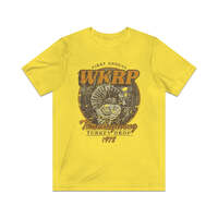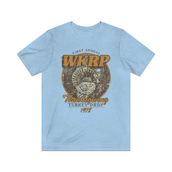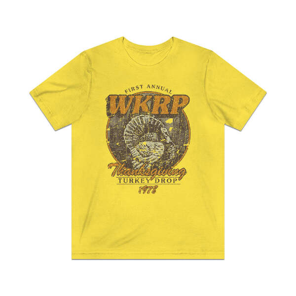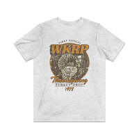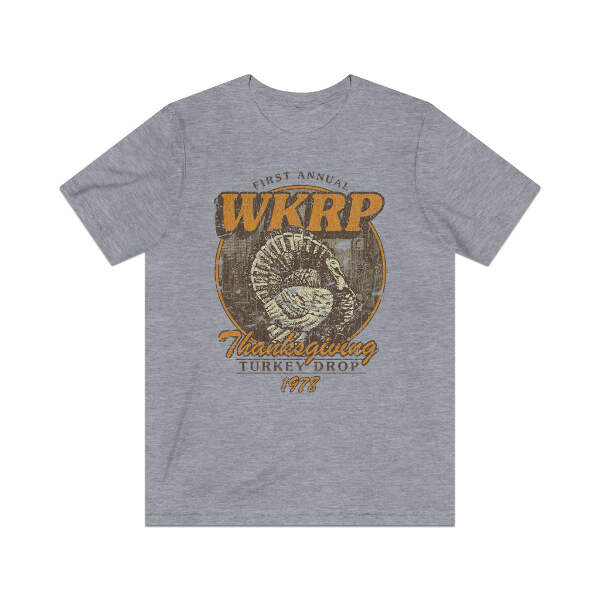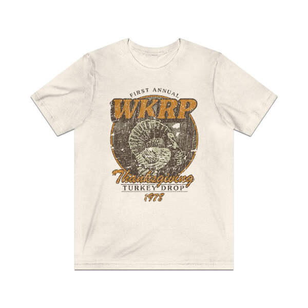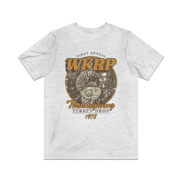 Description In the late seventies, there was a sitcom called WKRP in Cincinnati, which centered on a struggling radio station (WKRP) and the unique characters who work there trying to keep it afloat after switching formats from easy listening to rock and roll. In the “Turkeys Away” episode, which premiered on October 30, 1978, WKRP’s station manager believed that he had come up with what was “the greatest promotional idea of all time” for Thanksgiving. This promotion involved hiring a helicopter to drop live turkey's at a local mall, but apparently, nobody involved was aware that turkeys are flightless birds, something we all picked up on from WKRP's newsman in his live remote coverage: “Something just came out of the back of the helicopter. It’s a dark object. Perhaps a skydiver. A second. A third… No parachute yet. Oh my God! They’re turkeys!” They’re crashing to the earth right in front of our eyes! One just went through the windshield of a parked car! This is terrible! Oh, the humanity! The turkeys are hitting the ground like sacks of wet cement! The crowd is running for their lives!” Needless to say, the promotion was a bust, but it did garner the station some attention, albeit not the kind that they had wanted. While WKRP wasn't a routinely stellar show by any means, the cast clicked well, and it definitely had its moments, the “Turkeys Away” episode being one of them, as more than four decades later it still has a place in the collective pop-culture memory of Americans of all ages. Details Like all our designs, this one is treated with our signature ‘relic-ing’ process which includes our own secret recipe of hand-painted chipping, cracking, fading, and just the right touch of yellowing to ensure that it looks the part of a true vintage imprint.** We lay these works of art down on premium Bella+Canvas 3001 Unisex Jersey Short Sleeve Tees, one of the softest, best-wearing t-shirts available today, via state of the art direct to garment (DTG) printing which allows us to create a vintage effect that simply can’t be accomplished with other printing methods. In short, these shirts are everything you’ve dreamed of and more – it feels soft and lightweight with just the right amount of stretch making it comfortable and flattering for both men and women. 100% combed and ring-spun cotton* Fabric weight: 4.2 oz (142 g/m2) 30 single Tear-away label Shoulder-to-shoulder taping Side-seamed Retail fit Runs true to size Sizing Not sure what size is your best fit? We recommend taking one of your current t-shirts, laying it flat and measuring it. The measurements in the chart below are taken with the shirt laying on a flat surface. To get the length, measure from the high shoulder point down to the bottom of the shirt. To get the width, measure approximately 1-inch below the armhole, across the chest, from seam to seam. While our tees are all made using premium, pre-shrunk, ring-spun cotton, there can be some shrinkage depending on your personal wash and dry cycles. With that said, if you're on the fence, we always suggest going up a size. S M L XL 2XL 3XL 4XL Width 17.99 20.00 22.01 24.02 25.98 27.99 30.00 Length 27.99 29.02 30.00 31.02 32.01 32.99 33.98 Sleeve length 8.90 9.17 9.45 9.72 10.00 10.39 10.79 All sizes are provided in inches! *Heather colors are 52% combed and ring-spun cotton/48% polyester. Athletic and Black Heather is 90% combed and ring-spun cotton/10% polyester. Ash color is 99% Airlume combed and ring-spun cotton and 1% poly. **Due to the nature of the printing process and different sizes of shirts offered, imprint position and scale may vary slightly from the product images, but we do our best to be as accurate as possible.