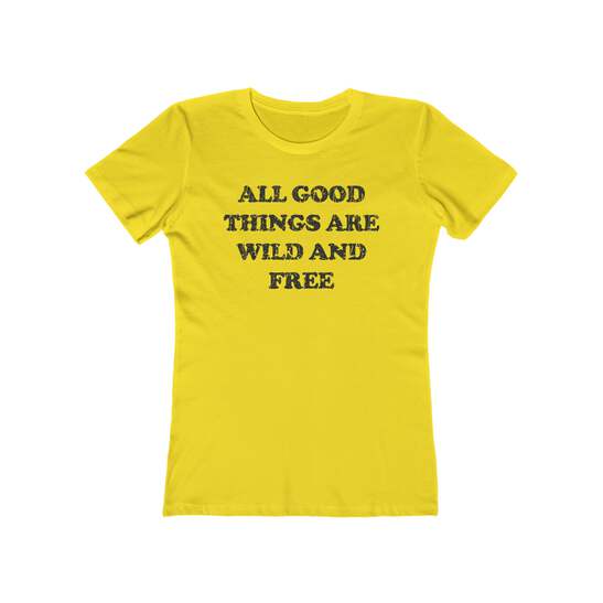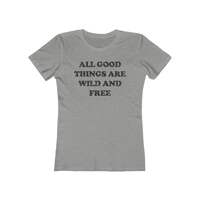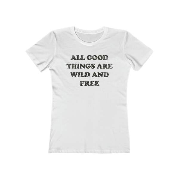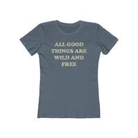 Description Another killer thrift store find that has been faithfully reproduced and made available once again. This gem was culled from a small shop outside of Cleveland, Ohio. It's a simple enough design that features Henry David Thoreau's powerful quote “all good things are wild and free” from his 1851 lecture, 'Walking.' Whether you're a woodland creature superfan or just a free spirit looking for that perfect road trip mantra, this one is for you. Details Like all our designs, this one is treated with our signature ‘relic-ing’ process which includes our own secret recipe of hand-painted chipping, cracking, fading, and just the right touch of yellowing to ensure that it looks the part of a true vintage imprint.** We lay these works of art down on premium Next Level 3900 Premium Women’s tees, aka ‘the boyfriend tee, one of the softest, best-wearing women’s t-shirts available today. We utilize state of the art direct to garment (DTG) printing which allows us to create a vintage effect that simply can’t be accomplished with other printing methods. In short, these shirts are everything you’ve dreamed of and more – it feels soft and lightweight with just the right amount of stretch making it both comfortable and flattering while the feminine fit and shorter sleeves add a special touch to this classic missy cut tee. Slim fit with longer body length 100% Soft cotton (fibre content may vary for different colors) Light fabric (145 grams/4.3oz.) 32 singles Tear away label Runs smaller than usual Sizing Not sure what size is your best fit? We recommend taking one of your current t-shirts, laying it flat and measuring it. The measurements in the chart below are taken with the shirt laying on a flat surface. To get the length, measure from the high shoulder point down to the bottom of the shirt. To get the width, measure approximately 1-inch below the armhole, across the chest, from seam to seam. The Next Level 3900 is a fitted women's t-shirt, so if you are looking for a roomier fit, we suggest going up a size or with the unisex Bella + Canvas 3001 we print our men's t-shirts on as they are the same super soft ring-spun cotton that feels like an old favorite. While our tees are all made using premium, pre-shrunk, ring-spun cotton, there can be some shrinkage depending on your personal wash and dry cycles. With that said, if you're on the fence, we always suggest going up a size. S M L XL 2XL 3XL Width, 16.23 17.25 18.23 19.77 21.26 22.76 Length 25.36 25.99 26.62 27.25 27.88 28.51 Sleeves 6.82 7.05 7.29 7.52 7.76 8 All sizes are provided in inches! *Heather colors are 90% ring-spun cotton and 10% poly. **Due to the nature of the printing process and different sizes of shirts offered, imprint position and scale may vary slightly from the product images, but we do our best to be as accurate as possible.