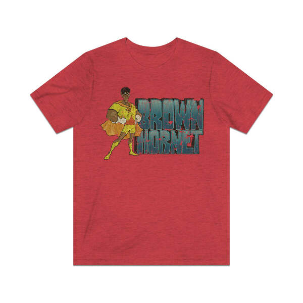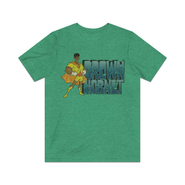Description The Brown Hornet is a "show-within-a-show," featured in The New Fat Albert Show from 1979 until 1984. To wit, The Brown Hornet is the title character of a TV show frequently watched by Fat Albert and the rest of the Junkyard Gang. In the show, the Brown Hornet is able to almost effortlessly defeat his adversaries, and in the process teach valuable life lessons to the villain, and also to the viewers which, though initially ambiguous, are remembered and clearly applied to whatever situation Fat Albert or the others are dealing with in each episode. Details Like all our designs, this one is treated with our signature ‘relic-ing’ process which includes our own secret recipe of hand-painted chipping, cracking, fading, and just the right touch of yellowing to ensure that it looks the part of a true vintage imprint.** We lay these works of art down on premium Bella+Canvas 3001 Unisex Jersey Short Sleeve Tees, one of the softest, best-wearing t-shirts available today, via state of the art direct to garment (DTG) printing which allows us to create a vintage effect that simply can’t be accomplished with other printing methods. In short, these shirts are everything you’ve dreamed of and more – it feels soft and lightweight with just the right amount of stretch making it comfortable and flattering for both men and women. 100% combed and ring-spun cotton* Fabric weight: 4.2 oz (142 g/m2) 30 single Tear-away label Shoulder-to-shoulder taping Side-seamed Retail fit Runs true to size Sizing Not sure what size is your best fit? We recommend taking one of your current t-shirts, laying it flat and measuring it. The measurements in the chart below are taken with the shirt laying on a flat surface. To get the length, measure from the high shoulder point down to the bottom of the shirt. To get the width, measure approximately 1-inch below the armhole, across the chest, from seam to seam. While our tees are all made using premium, pre-shrunk, ring-spun cotton, there can be some shrinkage depending on your personal wash and dry cycles. With that said, if you're on the fence, we always suggest going up a size. S M L XL 2XL 3XL Width 18 20 22.01 24.02 25.99 28 Length 28 29.02 30 31.03 32.01 33 Sleeves 8.9 9.18 9.45 9.73 10 10.4 All sizes are provided in inches! *Heather colors are 52% combed and ring-spun cotton/48% polyester. Athletic and Black Heather is 90% combed and ring-spun cotton/10% polyester. Ash color is 99% Airlume combed and ring-spun cotton and 1% poly. **Due to the nature of the printing process and different sizes of shirts offered, imprint position and scale may vary slightly from the product images, but we do our best to be as accurate as possible.