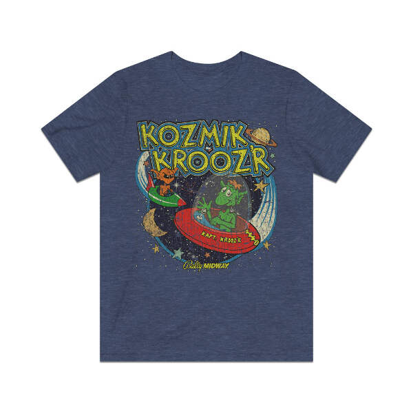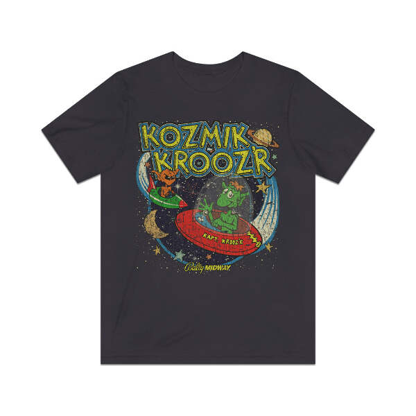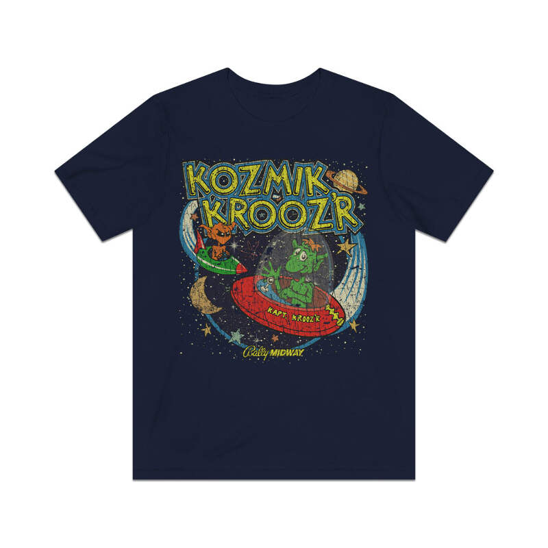Description Kozmik Krooz'r is a shoot 'em up video game released in arcades in 1982. The spaceship, a core element of the gameplay, is not an in-game graphic, but a physical plastic model. A series of mirrors projects the mothership just above the game's monitor. Players guide Kapt. Krooz'r to a rotating mothership at the top of the playfield, one which can only be entered when its tractor beam is operational. Players can also shoot enemies in one of eight directions and deflect firepower during their journey. Every fifth round, there is a bonus level where Kapt. Krooz'r must pick up space junk, but otherwise this game suffers from being exactly the same on every single level. Details Like all our designs, this one is treated with our signature ‘relic-ing’ process which includes our own secret recipe of hand-painted chipping, cracking, fading, and just the right touch of yellowing to ensure that it looks the part of a true vintage imprint.** We lay these works of art down on premium Bella+Canvas 3001 Unisex Jersey Short Sleeve Tees, one of the softest, best-wearing t-shirts available today, via state of the art direct to garment (DTG) printing which allows us to create a vintage effect that simply can’t be accomplished with other printing methods. In short, these shirts are everything you’ve dreamed of and more – it feels soft and lightweight with just the right amount of stretch making it comfortable and flattering for both men and women. 100% combed and ring-spun cotton* Fabric weight: 4.2 oz (142 g/m2) 30 single Tear-away label Shoulder-to-shoulder taping Side-seamed Retail fit Runs true to size Sizing Not sure what size is your best fit? We recommend taking one of your current t-shirts, laying it flat and measuring it. The measurements in the chart below are taken with the shirt laying on a flat surface. To get the length, measure from the high shoulder point down to the bottom of the shirt. To get the width, measure approximately 1-inch below the armhole, across the chest, from seam to seam. While our tees are all made using premium, pre-shrunk, ring-spun cotton, there can be some shrinkage depending on your personal wash and dry cycles. With that said, if you're on the fence, we always suggest going up a size. S M L XL 2XL 3XL Width 18 20 22.01 24.02 25.99 28 Length 28 29.02 30 31.03 32.01 33 Sleeves 8.9 9.18 9.45 9.73 10 10.4 All sizes are provided in inches! *Heather colors are 52% combed and ring-spun cotton/48% polyester. Athletic and Black Heather is 90% combed and ring-spun cotton/10% polyester. Ash color is 99% Airlume combed and ring-spun cotton and 1% poly. **Due to the nature of the printing process and different sizes of shirts offered, imprint position and scale may vary slightly from the product images, but we do our best to be as accurate as possible.