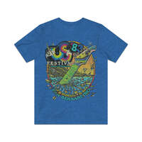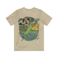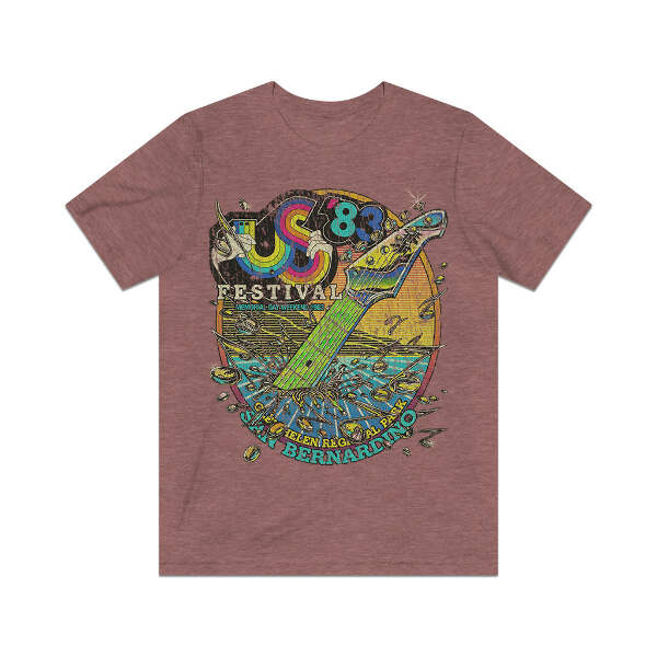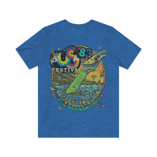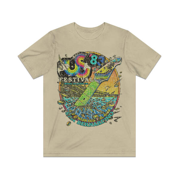 The US Festival (US pronounced like the pronoun, not as initials) was the name of two early '80s music festivals held in San Bernardino, California. Created by Steve Wozniak, who believed that the '70s were the "me" generation, he intended the US Festivals to encourage the '80s to be more community-oriented and combine technology with music. The first event was held over Labor Day weekend in September '82, and the second was less than nine months later, over Memorial Day weekend in May '83. The '82 event had a mix of bands slotted over the three-day event, but '83 added themed days. May 28 was New Wave Day, May 29 was Heavy Metal Day, and May 30 was Rock Day. A Country Day was added that was held the following weekend on Saturday, June 4th. Total attendance for the three days in '82 was about 400,000, and the '83 event exceeded 670,000. While the US Festival events were hugely popular with concert-goers, both events managed to lose $12 million, making them commercial failures. This single-sided design includes just a front print… for the front/back print version, check our store!