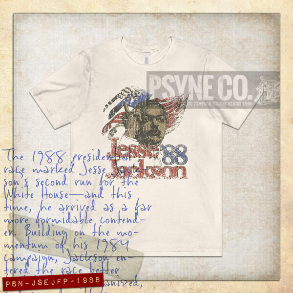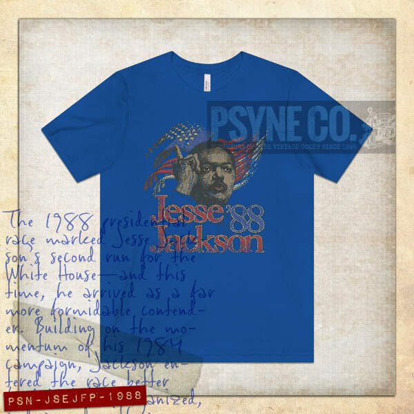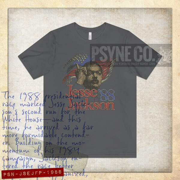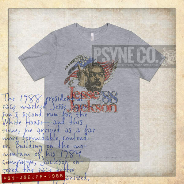 Design Description The 1988 presidential race marked Jesse Jackson’s second run for the White House—and this time, he arrived as a far more formidable contender. Building on the momentum of his 1984 campaign, Jackson entered the race better funded, better organized, and armed with a growing national coalition. While many skeptics dismissed his chances, he stunned observers by more than doubling his previous delegate count, leading some commentators to dub 1988 “the Year of Jackson.” Jackson battled all the way to the final primaries, including California, ultimately finishing second in delegates to nominee Michael Dukakis. Along the way, he outpaced a crowded Democratic field that included future political heavyweights such as Al Gore and Joe Biden, proving his campaign was a transformative force in modern American politics. Product Details Like all our designs, this one is treated with our signature ‘relic-ing’ process which includes our own secret recipe of hand-painted chipping, cracking, fading, and just the right touch of yellowing to ensure that it looks the part of a true vintage imprint.** We lay these works of art down on premium Bella+Canvas 3001 Unisex Jersey Short Sleeve Tees, one of the softest, best-wearing t-shirts available today, via state of the art direct to garment (DTG) printing which allows us to create a vintage effect that simply can’t be accomplished with other printing methods. In short, these shirts are everything you’ve dreamed of and more – it feels soft and lightweight with just the right amount of stretch, making it comfortable and flattering for both men and women. 100% combed and ring-spun cotton* Fabric weight: 4.2 oz (142 g/m2) 32 singles for a softer hand Dyed and cut in the USA Shoulder-to-shoulder taping Side-seamed construction Tear-away label Modern retail fit Runs true to size *Heather CVC Colors: 52% Airlume combed and ring-spun cotton, 48% polyester, 32 singles, 4.2 oz. Athletic Heather and Black Heather CVC: 90% Airlume combed and ring-spun cotton, 10% polyester, 32 singles, 4.2 oz. Heather Prism Colors: 99% Airlume combed and ring-spun cotton, 1% polyester, 32 singles, 4.2 oz. Heather Prism Blue: 90% Airlume combed and ring-spun cotton, 10% polyester, 32 singles, 4.2 oz. **Due to the nature of the printing process and different sizes of shirts offered, imprint position and scale may vary slightly from the product images, but we do our best to be as accurate as possible. Screen colors may vary due to differences in screens. Due to the natural nature of cotton, whites may appear off-white rather than bright white. Size Chart Not sure what size is your best fit? We recommend taking one of your current t-shirts, laying it flat and measuring it. The measurements in the chart below are taken with the shirt laying on a flat surface. To get the length, measure from the high shoulder point down to the bottom of the shirt. To get the width, measure approximately 1-inch below the armhole, across the chest, from seam to seam. While our tees are all made using premium, pre-shrunk, ring-spun cotton, there can be some shrinkage depending on your personal wash and dry cycles. With that said, if you’re on the fence, we always suggest going up a size. All sizes are provided in inches! Please note that variations in sizing of up to 1.5 inches are possible.Product Code: PSN-MMMXXX-1966