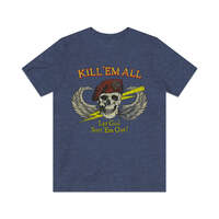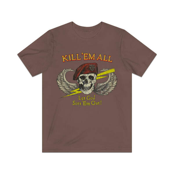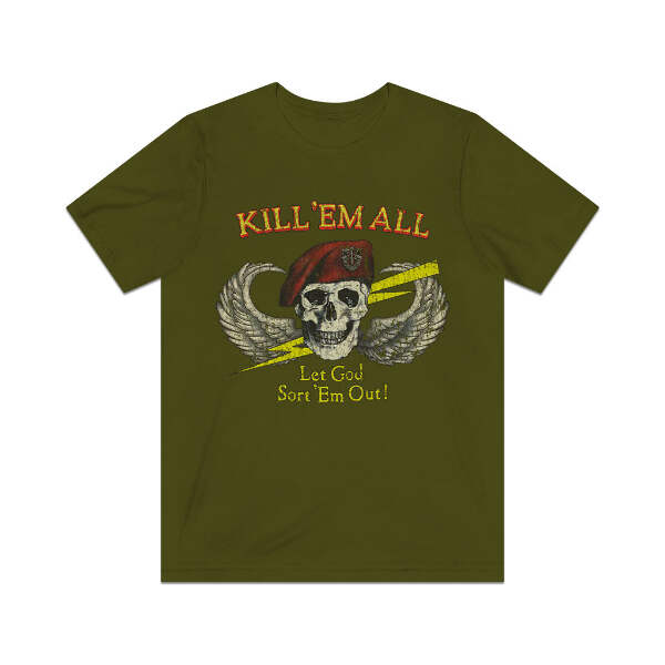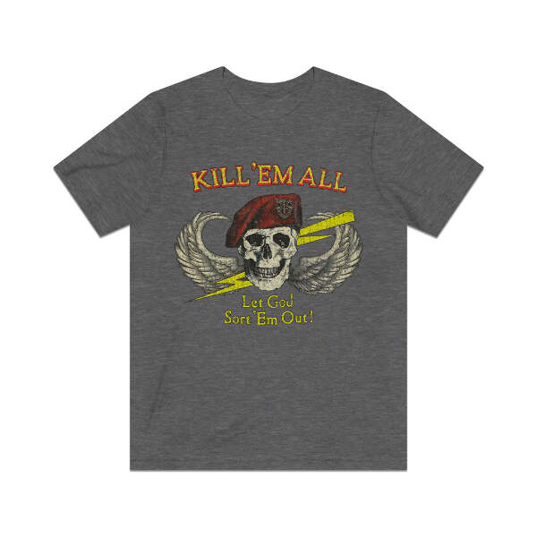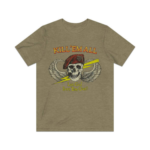 Description This classic Special Forces design never goes out of style, so whether you're an actual Green Beret or just some kid getting loaded in a parking lot before a metal show, this one is a perfect fit! Details Like all our designs, this one is treated with our signature ‘relic-ing’ process which includes our own secret recipe of hand-painted chipping, cracking, fading, and just the right touch of yellowing to ensure that it looks the part of a true vintage imprint.** We lay these works of art down on premium Bella+Canvas 3001 Unisex Jersey Short Sleeve Tees, one of the softest, best-wearing t-shirts available today, via state of the art direct to garment (DTG) printing which allows us to create a vintage effect that simply can’t be accomplished with other printing methods. In short, these shirts are everything you’ve dreamed of and more – it feels soft and lightweight with just the right amount of stretch making it comfortable and flattering for both men and women. 100% combed and ring-spun cotton* Fabric weight: 4.2 oz (142 g/m2) 30 single Tear-away label Shoulder-to-shoulder taping Side-seamed Retail fit Runs true to size Sizing Not sure what size is your best fit? We recommend taking one of your current t-shirts, laying it flat and measuring it. The measurements in the chart below are taken with the shirt laying on a flat surface. To get the length, measure from the high shoulder point down to the bottom of the shirt. To get the width, measure approximately 1-inch below the armhole, across the chest, from seam to seam. While our tees are all made using premium, pre-shrunk, ring-spun cotton, there can be some shrinkage depending on your personal wash and dry cycles. With that said, if you're on the fence, we always suggest going up a size. S M L XL 2XL 3XL 4XL Width 17.99 20.00 22.01 24.02 25.98 27.99 30.00 Length 27.99 29.02 30.00 31.02 32.01 32.99 33.98 Sleeve length 8.90 9.17 9.45 9.72 10.00 10.39 10.79 All sizes are provided in inches! *Heather colors are 52% combed and ring-spun cotton/48% polyester. Athletic and Black Heather is 90% combed and ring-spun cotton/10% polyester. Ash color is 99% Airlume combed and ring-spun cotton and 1% poly. **Due to the nature of the printing process and different sizes of shirts offered, imprint position and scale may vary slightly from the product images, but we do our best to be as accurate as possible.