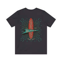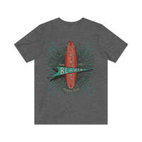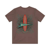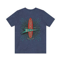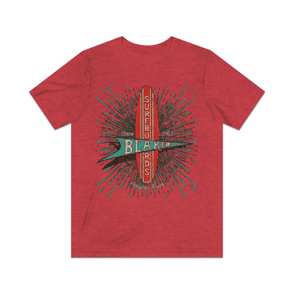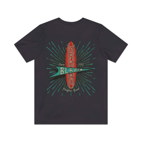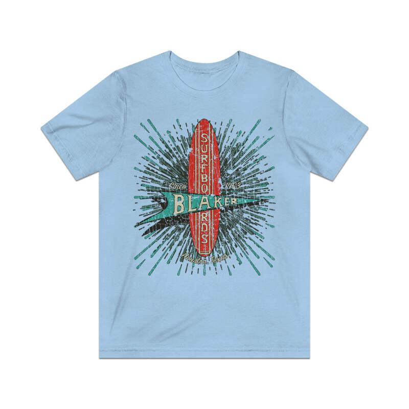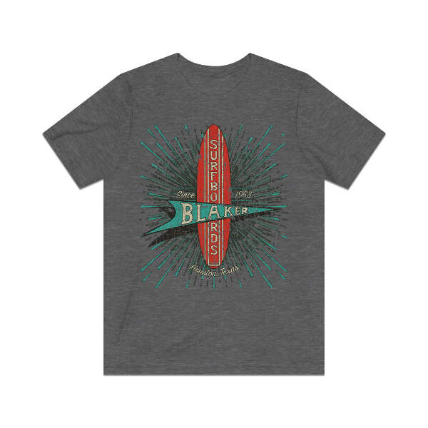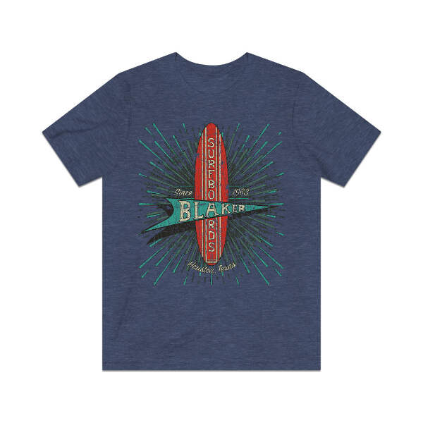 Description When you mention surfing, it's usually California or Florida that come to mind, but believe it or not, Texas actually has some pretty decent surf spots. Where this is surf, there are surfers, and where there are surfers, there are guys making surfboards. Such is the case in Houston, where McDonald “Mack” Blaker founded Blaker Surfboards in 1963. For seven years, Mack and his crew of shapers turned out custom Texas style surfboards that were made to order. They closed their doors in 1970, but many of these well-made boards are still out there and high desired by collectors and surfers alike. Details Like all our designs, this one is treated with our signature ‘relic-ing’ process which includes our own secret recipe of hand-painted chipping, cracking, fading, and just the right touch of yellowing to ensure that it looks the part of a true vintage imprint.** We lay these works of art down on premium Bella+Canvas 3001 Unisex Jersey Short Sleeve Tees, one of the softest, best-wearing t-shirts available today, via state of the art direct to garment (DTG) printing which allows us to create a vintage effect that simply can’t be accomplished with other printing methods. In short, these shirts are everything you’ve dreamed of and more – it feels soft and lightweight with just the right amount of stretch making it comfortable and flattering for both men and women. 100% combed and ring-spun cotton* Fabric weight: 4.2 oz (142 g/m2) 30 single Tear-away label Shoulder-to-shoulder taping Side-seamed Retail fit Runs true to size Sizing Not sure what size is your best fit? We recommend taking one of your current t-shirts, laying it flat and measuring it. The measurements in the chart below are taken with the shirt laying on a flat surface. To get the length, measure from the high shoulder point down to the bottom of the shirt. To get the width, measure approximately 1-inch below the armhole, across the chest, from seam to seam. While our tees are all made using premium, pre-shrunk, ring-spun cotton, there can be some shrinkage depending on your personal wash and dry cycles. With that said, if you're on the fence, we always suggest going up a size. S M L XL 2XL 3XL 4XL Width 17.99 20.00 22.01 24.02 25.98 27.99 30.00 Length 27.99 29.02 30.00 31.02 32.01 32.99 33.98 Sleeve length 8.90 9.17 9.45 9.72 10.00 10.39 10.79 All sizes are provided in inches! *Heather colors are 52% combed and ring-spun cotton/48% polyester. Athletic and Black Heather is 90% combed and ring-spun cotton/10% polyester. Ash color is 99% Airlume combed and ring-spun cotton and 1% poly. **Due to the nature of the printing process and different sizes of shirts offered, imprint position and scale may vary slightly from the product images, but we do our best to be as accurate as possible.