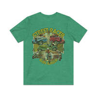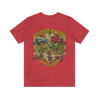 Description Street Racer is a racing video game that was released in September 1977 as one of the nine VCS launch titles, which included 27 game variations as game cartridge number CX-2612. Each of the sub-games had roughly the same gameplay: the player controlled a vehicle that must avoid or collect certain objects as they scroll down the screen. Between one and four players could compete simultaneously by using the paddle controllers, which allow the vehicle to move left and right along the bottom of the screen. If a one-player game is selected, the player competes with a static computer opponent that allows objects to collide with it or pass by. Details Like all our designs, this one is treated with our signature ‘relic-ing’ process which includes our own secret recipe of hand-painted chipping, cracking, fading, and just the right touch of yellowing to ensure that it looks the part of a true vintage imprint.** We lay these works of art down on premium Bella+Canvas 3001 Unisex Jersey Short Sleeve Tees, one of the softest, best-wearing t-shirts available today, via state of the art direct to garment (DTG) printing which allows us to create a vintage effect that simply can’t be accomplished with other printing methods. In short, these shirts are everything you’ve dreamed of and more – it feels soft and lightweight with just the right amount of stretch making it comfortable and flattering for both men and women. 100% combed and ring-spun cotton* Fabric weight: 4.2 oz (142 g/m2) 30 single Tear-away label Shoulder-to-shoulder taping Side-seamed Retail fit Runs true to size Sizing Not sure what size is your best fit? We recommend taking one of your current t-shirts, laying it flat and measuring it. The measurements in the chart below are taken with the shirt laying on a flat surface. To get the length, measure from the high shoulder point down to the bottom of the shirt. To get the width, measure approximately 1-inch below the armhole, across the chest, from seam to seam. While our tees are all made using premium, pre-shrunk, ring-spun cotton, there can be some shrinkage depending on your personal wash and dry cycles. With that said, if you're on the fence, we always suggest going up a size. S M L XL 2XL 3XL 4XL Width 17.99 20.00 22.01 24.02 25.98 27.99 30.00 Length 27.99 29.02 30.00 31.02 32.01 32.99 33.98 Sleeve length 8.90 9.17 9.45 9.72 10.00 10.39 10.79 All sizes are provided in inches! *Heather colors are 52% combed and ring-spun cotton/48% polyester. Athletic and Black Heather is 90% combed and ring-spun cotton/10% polyester. Ash color is 99% Airlume combed and ring-spun cotton and 1% poly. **Due to the nature of the printing process and different sizes of shirts offered, imprint position and scale may vary slightly from the product images, but we do our best to be as accurate as possible.