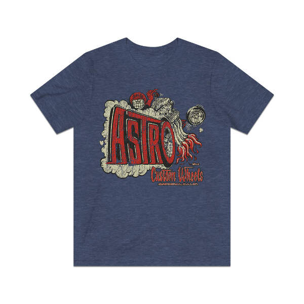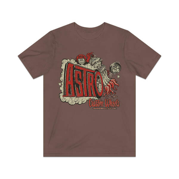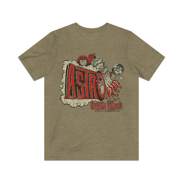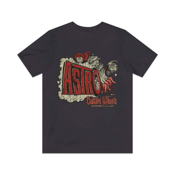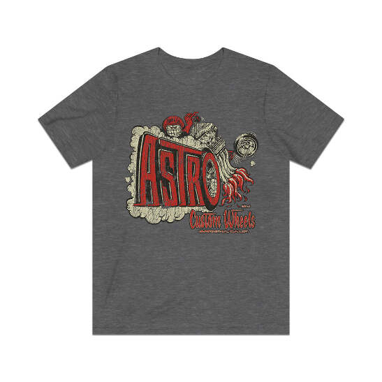 Description In the '60s, chromed factory steel wheels had taken the shows and streets by storm. Fat-fendered radical customs with their chopped tops, sectioned bodies, and other extensive modifications were falling out of favor, with radically painted late model cars now dominating the world of customs. It was around this time that several manufacturers saw that an affordably priced custom wheel was something that the hot rod and custom world desperately needed. Gardenia, California's Astro Custom Wheels was one of the many builders who threw their hat into the ring, making wheels that were equal parts show and go, so you could cruise the boulevard on Friday night, but tear up the quarter-mile on Saturday morning. Details Like all our designs, this one is treated with our signature ‘relic-ing’ process which includes our own secret recipe of hand-painted chipping, cracking, fading, and just the right touch of yellowing to ensure that it looks the part of a true vintage imprint.** We lay these works of art down on premium Bella+Canvas 3001 Unisex Jersey Short Sleeve Tees, one of the softest, best-wearing t-shirts available today, via state of the art direct to garment (DTG) printing which allows us to create a vintage effect that simply can’t be accomplished with other printing methods. In short, these shirts are everything you’ve dreamed of and more – it feels soft and lightweight with just the right amount of stretch making it comfortable and flattering for both men and women. 100% combed and ring-spun cotton* Fabric weight: 4.2 oz (142 g/m2) 30 single Tear-away label Shoulder-to-shoulder taping Side-seamed Retail fit Runs true to size Sizing Not sure what size is your best fit? We recommend taking one of your current t-shirts, laying it flat and measuring it. The measurements in the chart below are taken with the shirt laying on a flat surface. To get the length, measure from the high shoulder point down to the bottom of the shirt. To get the width, measure approximately 1-inch below the armhole, across the chest, from seam to seam. While our tees are all made using premium, pre-shrunk, ring-spun cotton, there can be some shrinkage depending on your personal wash and dry cycles. With that said, if you're on the fence, we always suggest going up a size. S M L XL 2XL 3XL Width 18 20 22.01 24.02 25.99 28 Length 28 29.02 30 31.03 32.01 33 Sleeves 8.9 9.18 9.45 9.73 10 10.4 All sizes are provided in inches! *Heather colors are 52% combed and ring-spun cotton/48% polyester. Athletic and Black Heather is 90% combed and ring-spun cotton/10% polyester. Ash color is 99% Airlume combed and ring-spun cotton and 1% poly. **Due to the nature of the printing process and different sizes of shirts offered, imprint position and scale may vary slightly from the product images, but we do our best to be as accurate as possible.