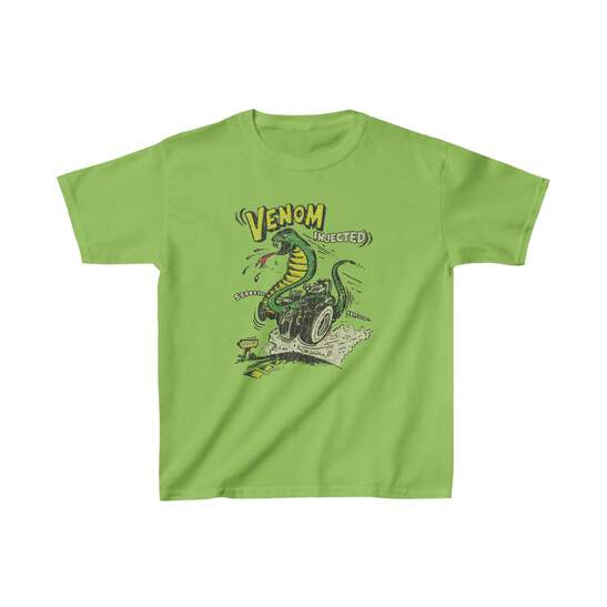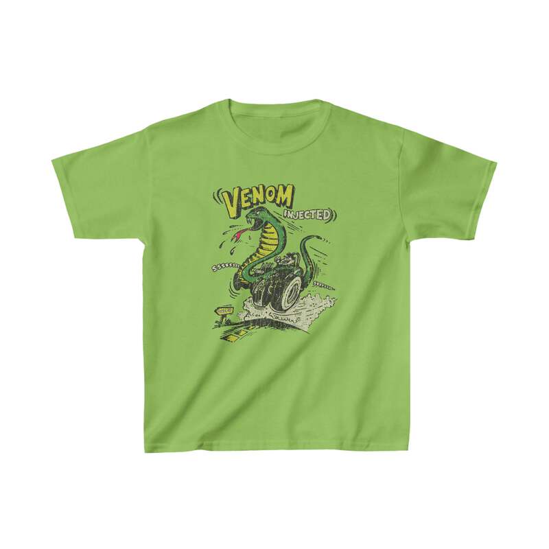 Description This vintage hot-rod inspired design was culled from an NOS (new old stock) decal dated 1969 and features a cobra snake hot rod tearing it up on the way to the love in. While it's cool enough on its own, we're pretty sure that Mustang Cobra owners will be especially appreciative of this one in all its muscle car era campy goodness. Details Like all our designs, this one is treated with our signature ‘relic-ing’ process which includes our own secret recipe of hand-painted chipping, cracking, fading, and just the right touch of yellowing to ensure that it looks the part of a true vintage imprint.** We lay these works of art down on premium Gildan 5000B tees, one of the best-wearing kid's t-shirts available today, via state of the art direct to garment (DTG) printing which allows us to create a vintage effect that simply can’t be accomplished with other printing methods. In short, this youth pro weight tee is perfect for every kid who wants a comfortable shirt to play, relax, or romp around in and our durable, high-quality prints will survive many adventures. Regular fit 100% preshrunk jersey knit cotton (fibre content may vary for different colors*) Light fabric (5.3 oz/yd²) Tear away label Seamless double-needle 3/4" collar with double-needle sleeve and bottom hems Sizing Not sure what size is your best fit? We recommend taking one of your current t-shirts, laying it flat and measuring it. The measurements in the chart below are taken with the shirt laying on a flat surface. To get the length, measure from the high shoulder point down to the bottom of the shirt. To get the width, measure approximately 1-inch below the armhole, across the chest, from seam to seam. While our tees are all made using premium, pre-shrunk, ring-spun cotton, there can be some shrinkage depending on your personal wash and dry cycles. With that said, if you're on the fence, we always suggest going up a size. XS S M L XL Width 16.15 16.93 18.12 18.90 20.08 Length 20.48 22.05 23.63 25.20 26.38 Sleeves 6.34 7.01 7.49 8.00 8.51 All sizes are provided in inches! *Sport Grey is 90/10 cotton/polyester and Ash Grey: 99/1 cotton/polyester. **Due to the nature of the printing process and different sizes of shirts offered, imprint position and scale may vary slightly from the product images, but we do our best to be as accurate as possible.