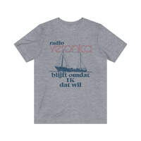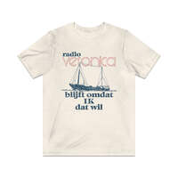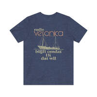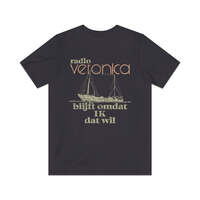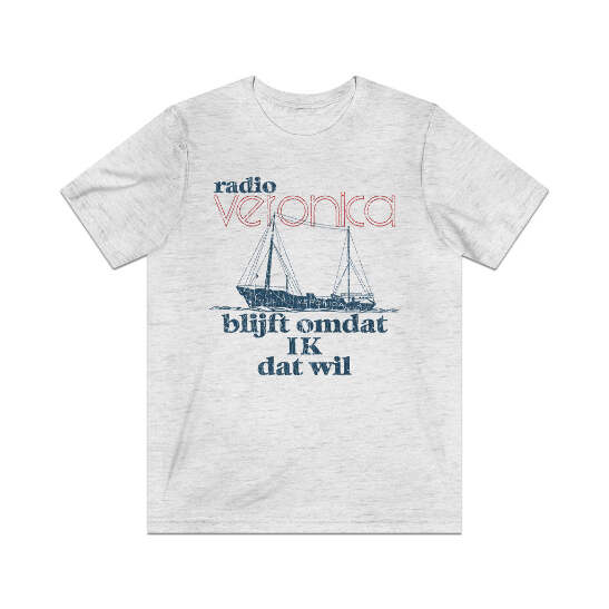 Radio Veronica was a Dutch pirate radio station that began broadcasting in 1960 from a ship anchored in the North Sea, catching much ire from authorities. It was set up by independent radio, TV, and household electrical retailers in the Netherlands to stimulate the sales of radio receivers by providing an alternative to the state-licensed stations of the Netherlands. Broadcasts began on April 21, 1960, with the station announcing itself as VRON (Vrije Radio Omroep Nederland; Free Radio Station [of the] Netherlands) but changed to Radio Veronica, after the poem "Het Zwarte Schaap Veronica" (The Black Sheep Veronica) by the children's poet Annie M. G. Schmidt. Radio Veronica became the most popular station in the Netherlands, again, irking Dutch authorities who controlled all radio stations at the time. Most of its programs were recorded in a studio on the Hilversum. Despite the station's popularity, the Dutch government passed anti-pirate legislation after Radio Veronica broadcasted offshore for over fourteen years, announcing that the law was to come into effect on September 1,1974. Veronica chose to close down at 6:00 pm on August 31, 1974. The final hour was, like most of Veronica's programs, pre-recorded in the station's studios in Hilversum, with a final news broadcast live from the ship. This design feature's the station's original logo with their tagline "blijft omdat IK dat wil" which translates as "stays because I want to."