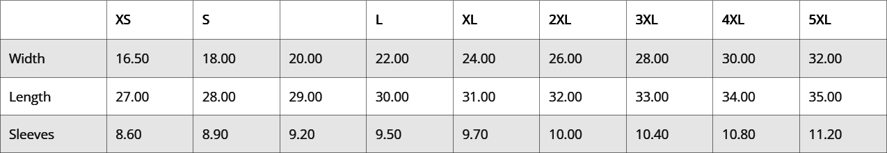 Not sure what size is your best fit? We recommend taking one of your current t-shirts, laying it flat and measuring it. The measurements in the chart below are taken with the shirt laying on a flat surface. To get the length, measure from the high shoulder point down to the bottom of the shirt. To get the width, measure approximately 1-inch below the armhole, across the chest, from seam to seam. While our tees are all made using premium, pre-shrunk, ring-spun cotton, there can be some shrinkage depending on your personal wash and dry cycles. With that said, if you’re on the fence, we always suggest going up a size. ![]()