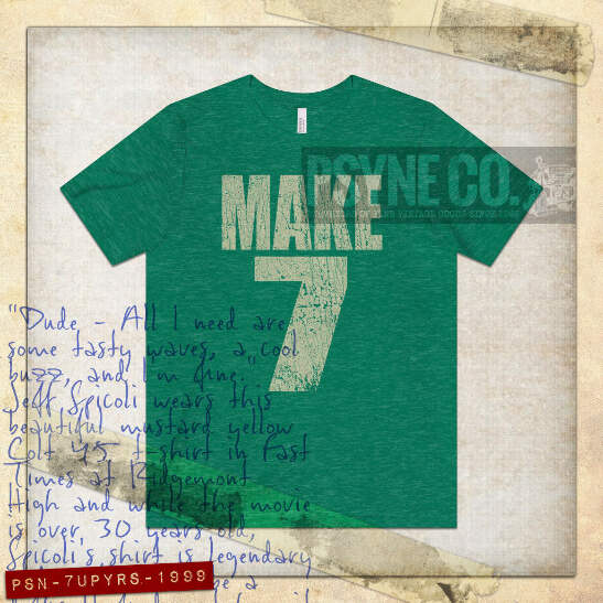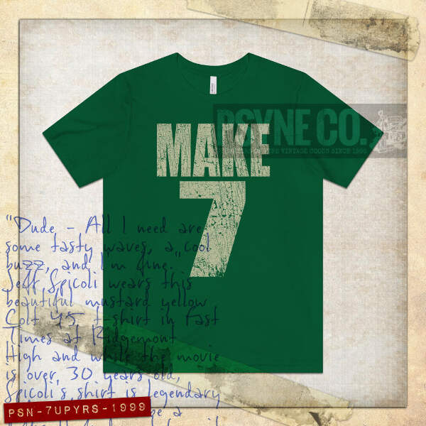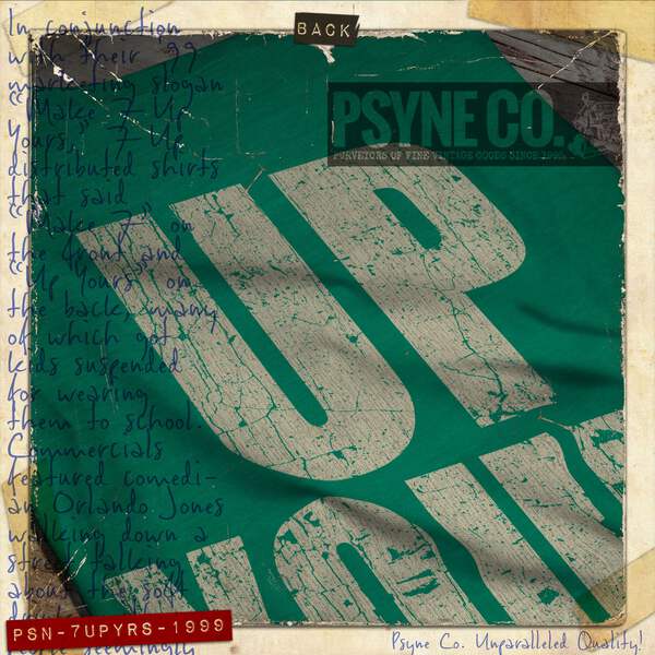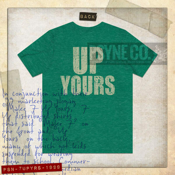 In conjunction with their '99 marketing slogan “Make 7 Up Yours,” 7 Up distributed shirts that said “Make 7” on the front and “Up Yours” on the back, many of which got kids suspended for wearing them to school. Commercials featured comedian Orlando Jones walking down a street talking about the soft drink, with people seemingly angry or shocked by the risqué phrase “up yours” after he passed them. The ads and slogan quickly became popular, and the campaign lasted until 2005. This two-sided design includes both front and back prints!