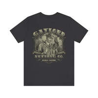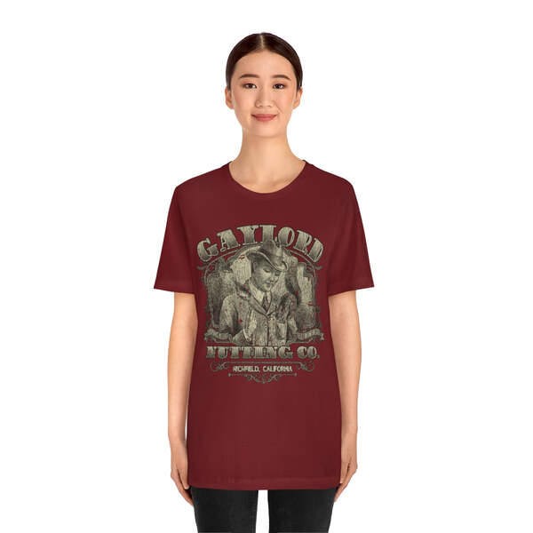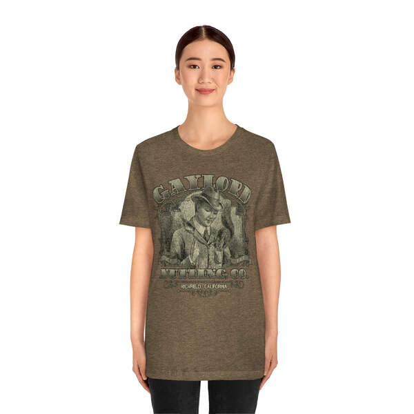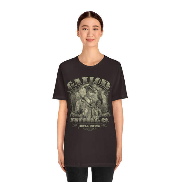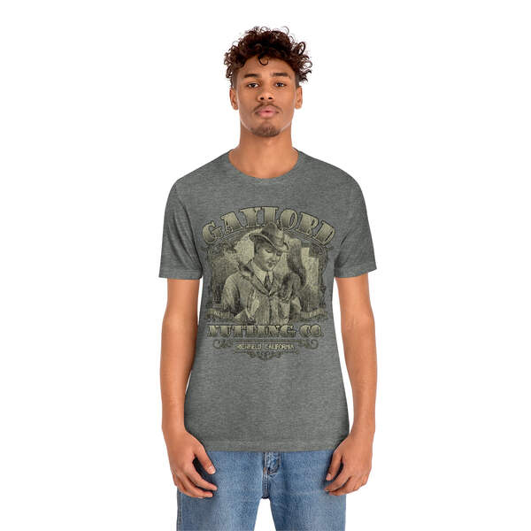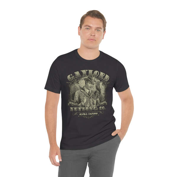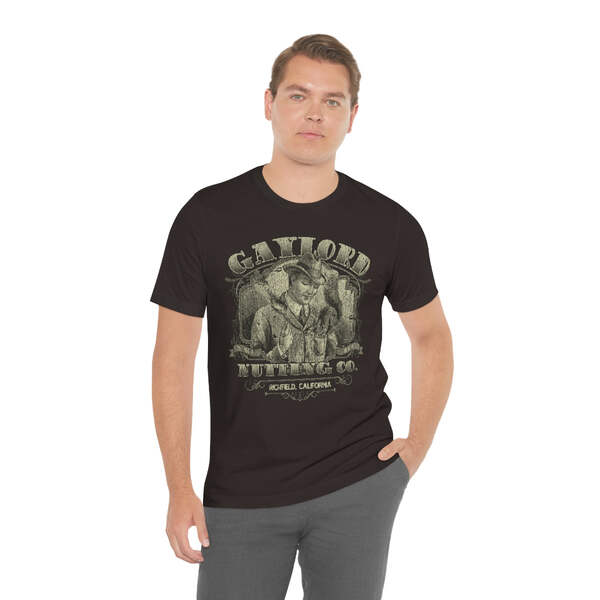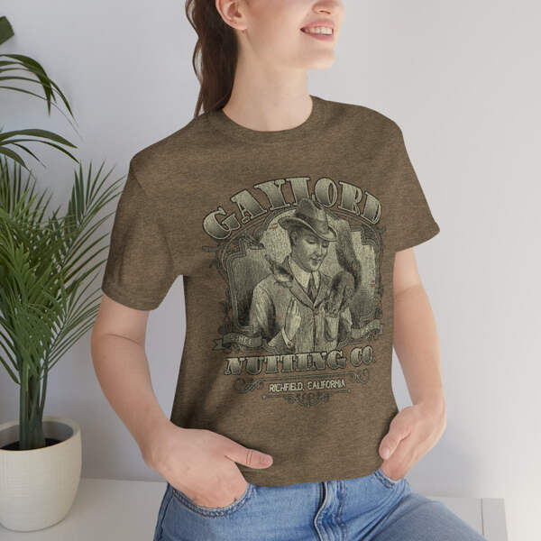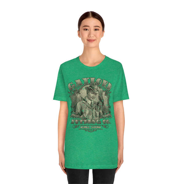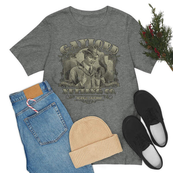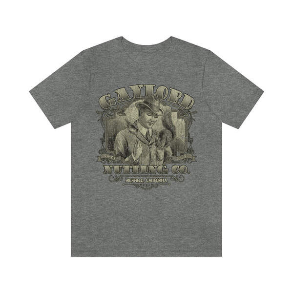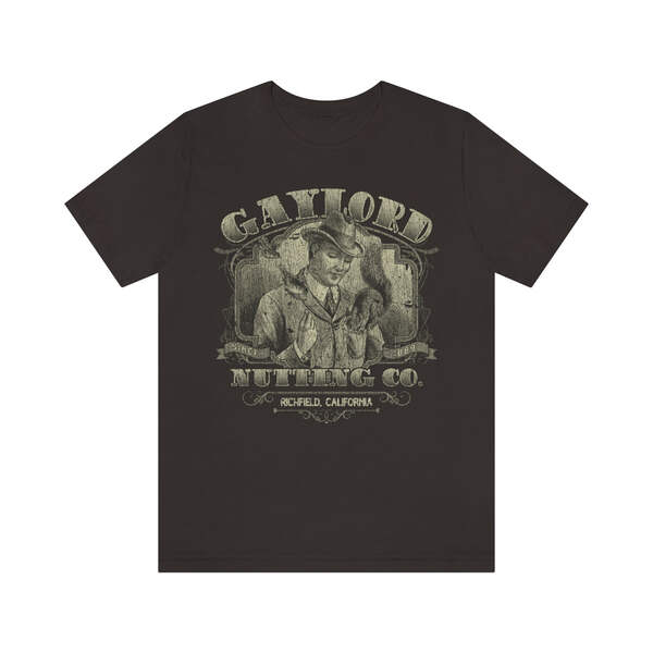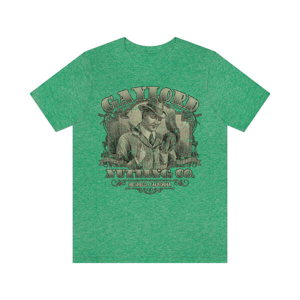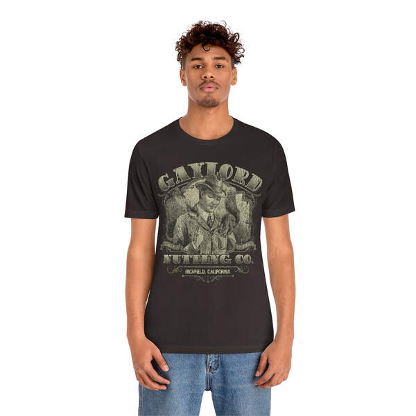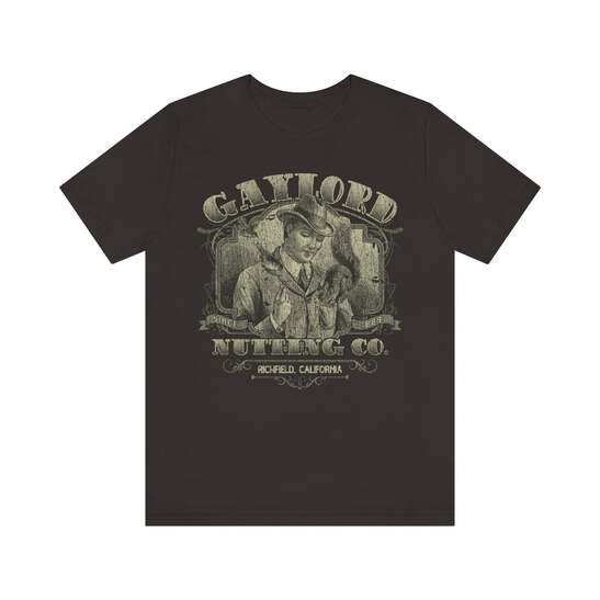 Description Founded in 1889, by William H. Gaylord, Gaylord Nutting Co. was one of California's first commercial producers of nuts with not just nationwide, but worldwide distribution, something that was no small feat in those days. William H. Gaylord owned thousands of acres of his own fields, and was known by local farmers as the place to go to sell their harvest for a fair price. From their factory building in the sleepy town of Richfield, Gaylord Nutting Co. processed and packaged many varietals of nuts from throughout California's Central Valley region. Details Like all our designs, this one is treated with our signature ‘relic-ing’ process which includes our own secret recipe of hand-painted chipping, cracking, fading, and just the right touch of yellowing to ensure that it looks the part of a true vintage imprint.** We lay these works of art down on premium Bella+Canvas 3001 Unisex Jersey Short Sleeve Tees, one of the softest, best-wearing t-shirts available today, via state of the art direct to garment (DTG) printing which allows us to create a vintage effect that simply can’t be accomplished with other printing methods. In short, these shirts are everything you’ve dreamed of and more – it feels soft and lightweight with just the right amount of stretch making it comfortable and flattering for both men and women. 100% combed and ring-spun cotton* Fabric weight: 4.2 oz (142 g/m2) 30 single Tear-away label Shoulder-to-shoulder taping Side-seamed Retail fit Runs true to size Sizing Not sure what size is your best fit? We recommend taking one of your current t-shirts, laying it flat and measuring it. The measurements in the chart below are taken with the shirt laying on a flat surface. To get the length, measure from the high shoulder point down to the bottom of the shirt. To get the width, measure approximately 1-inch below the armhole, across the chest, from seam to seam. While our tees are all made using premium, pre-shrunk, ring-spun cotton, there can be some shrinkage depending on your personal wash and dry cycles. With that said, if you're on the fence, we always suggest going up a size. S M L XL 2XL 3XL Width 18 20 22.01 24.02 25.99 28 Length 28 29.02 30 31.03 32.01 33 Sleeves 8.9 9.18 9.45 9.73 10 10.4 All sizes are provided in inches! *Heather colors are 52% combed and ring-spun cotton/48% polyester. Athletic and Black Heather is 90% combed and ring-spun cotton/10% polyester. Ash color is 99% Airlume combed and ring-spun cotton and 1% poly. **Due to the nature of the printing process and different sizes of shirts offered, imprint position and scale may vary slightly from the product images, but we do our best to be as accurate as possible.