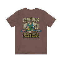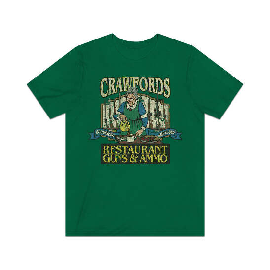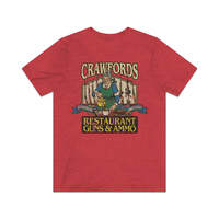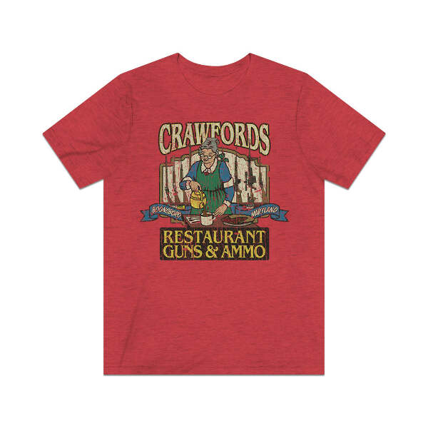 Description The Crawfords Restaurant, Guns & Ammo sign on Main Street in Boonsboro, Maryland was one of the most photographed signs in town for over 40 years. I'm not sure if it was the unusual pairing of offerings, the grandmotherly figure secretly flipping off passersby, or the missing apostrophe in the name, but people loved that sign. Part restaurant and part sporting goods/general store, Crawfords was a true small town gem that served up lunch, breakfast, and dinner with a side of shotguns, jigsaw puzzles, and live bait to locals and tourists alike, all with a down home and rather eclectic vibe like no other. Details Like all our designs, this one is treated with our signature ‘relic-ing’ process which includes our own secret recipe of hand-painted chipping, cracking, fading, and just the right touch of yellowing to ensure that it looks the part of a true vintage imprint.** We lay these works of art down on premium Bella+Canvas 3001 Unisex Jersey Short Sleeve Tees, one of the softest, best-wearing t-shirts available today, via state of the art direct to garment (DTG) printing which allows us to create a vintage effect that simply can’t be accomplished with other printing methods. In short, these shirts are everything you’ve dreamed of and more – it feels soft and lightweight with just the right amount of stretch making it comfortable and flattering for both men and women. 100% combed and ring-spun cotton* Fabric weight: 4.2 oz (142 g/m2) 30 single Tear-away label Shoulder-to-shoulder taping Side-seamed Retail fit Runs true to size Sizing Not sure what size is your best fit? We recommend taking one of your current t-shirts, laying it flat and measuring it. The measurements in the chart below are taken with the shirt laying on a flat surface. To get the length, measure from the high shoulder point down to the bottom of the shirt. To get the width, measure approximately 1-inch below the armhole, across the chest, from seam to seam. While our tees are all made using premium, pre-shrunk, ring-spun cotton, there can be some shrinkage depending on your personal wash and dry cycles. With that said, if you're on the fence, we always suggest going up a size. S M L XL 2XL 3XL Width 18 20 22.01 24.02 25.99 28 Length 28 29.02 30 31.03 32.01 33 Sleeves 8.9 9.18 9.45 9.73 10 10.4 All sizes are provided in inches! *Heather colors are 52% combed and ring-spun cotton/48% polyester. Athletic and Black Heather is 90% combed and ring-spun cotton/10% polyester. Ash color is 99% Airlume combed and ring-spun cotton and 1% poly. **Due to the nature of the printing process and different sizes of shirts offered, imprint position and scale may vary slightly from the product images, but we do our best to be as accurate as possible.