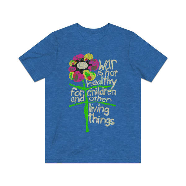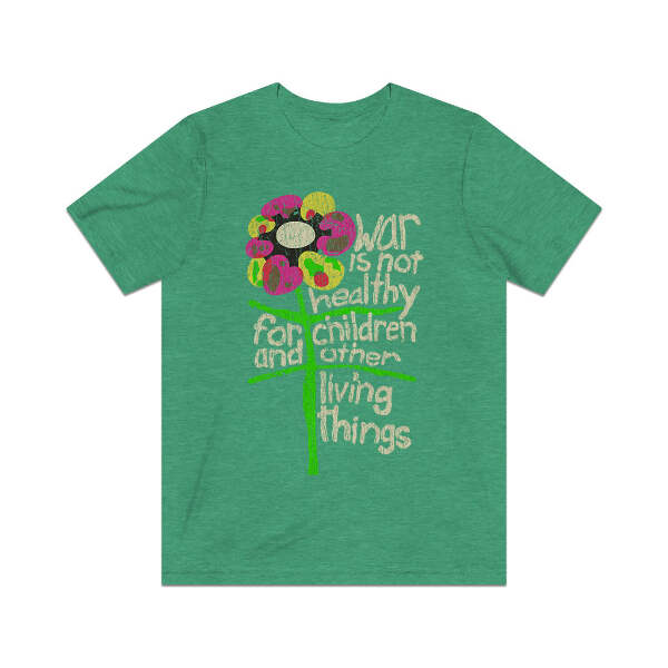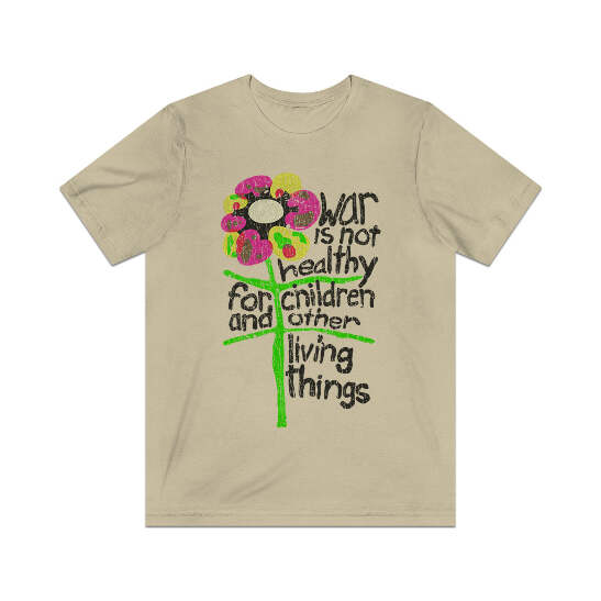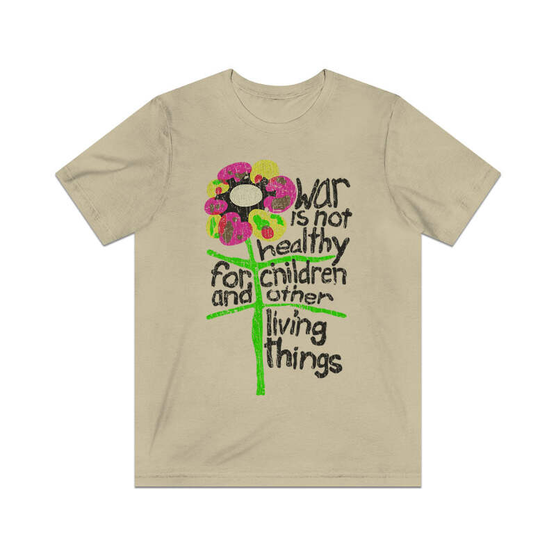 War is Not Healthy is based on a poster created by Lorraine Schneider in response to the outcry over the Vietnam War. The artists’ intention was to purposely give it the appearance that a child had created it. This unique style created one of the most iconic anti-war posters of all time that was a common sight in dorm rooms and on protest signs throughout the Vietnam era and beyond.