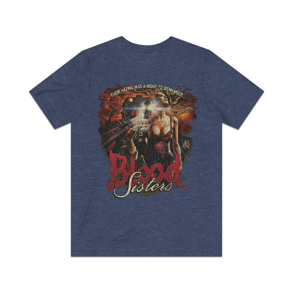 Description Blood Sisters is a 1987 supernatural slasher horror film. The plot goes something like this: thirteen years after a disturbed boy blasts his fat hooker mother and her trick to pieces with a shotgun, a group of sorority pledges must spend the night in the now deserted brothel and participate in a scavenger hunt as part of their initiation ceremony. To ensure a thoroughly terrifying experience awaits for the girls, three frat boys have rigged the house with pranks, but they really needn't have bothered, for the place is not only haunted by the ghosts of dead prostitutes and their customers, but is home to a knife wielding maniac as well. Details Like all our designs, this one is treated with our signature ‘relic-ing’ process which includes our own secret recipe of hand-painted chipping, cracking, fading, and just the right touch of yellowing to ensure that it looks the part of a true vintage imprint.** We lay these works of art down on premium Bella+Canvas 3001 Unisex Jersey Short Sleeve Tees, one of the softest, best-wearing t-shirts available today, via state of the art direct to garment (DTG) printing which allows us to create a vintage effect that simply can’t be accomplished with other printing methods. In short, these shirts are everything you’ve dreamed of and more – it feels soft and lightweight with just the right amount of stretch making it comfortable and flattering for both men and women. 100% combed and ring-spun cotton* Fabric weight: 4.2 oz (142 g/m2) 30 single Tear-away label Shoulder-to-shoulder taping Side-seamed Retail fit Runs true to size Sizing Not sure what size is your best fit? We recommend taking one of your current t-shirts, laying it flat and measuring it. The measurements in the chart below are taken with the shirt laying on a flat surface. To get the length, measure from the high shoulder point down to the bottom of the shirt. To get the width, measure approximately 1-inch below the armhole, across the chest, from seam to seam. While our tees are all made using premium, pre-shrunk, ring-spun cotton, there can be some shrinkage depending on your personal wash and dry cycles. With that said, if you're on the fence, we always suggest going up a size. S M L XL 2XL 3XL Width 18 20 22.01 24.02 25.99 28 Length 28 29.02 30 31.03 32.01 33 Sleeves 8.9 9.18 9.45 9.73 10 10.4 All sizes are provided in inches! *Heather colors are 52% combed and ring-spun cotton/48% polyester. Athletic and Black Heather is 90% combed and ring-spun cotton/10% polyester. Ash color is 99% Airlume combed and ring-spun cotton and 1% poly. **Due to the nature of the printing process and different sizes of shirts offered, imprint position and scale may vary slightly from the product images, but we do our best to be as accurate as possible.