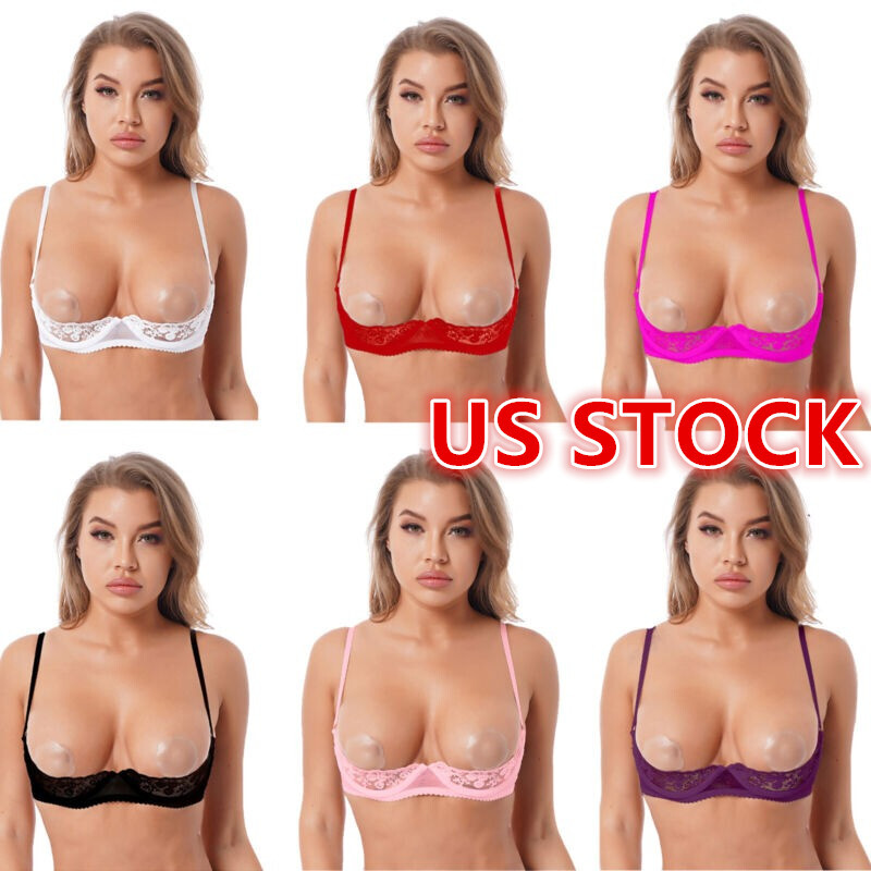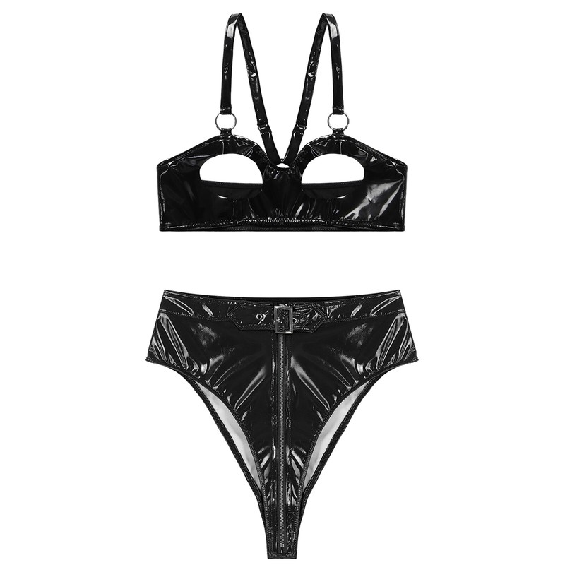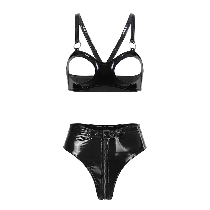 Womens Open Cups Bra Top with Floral Lace Trimming Patent Leather Briefs.