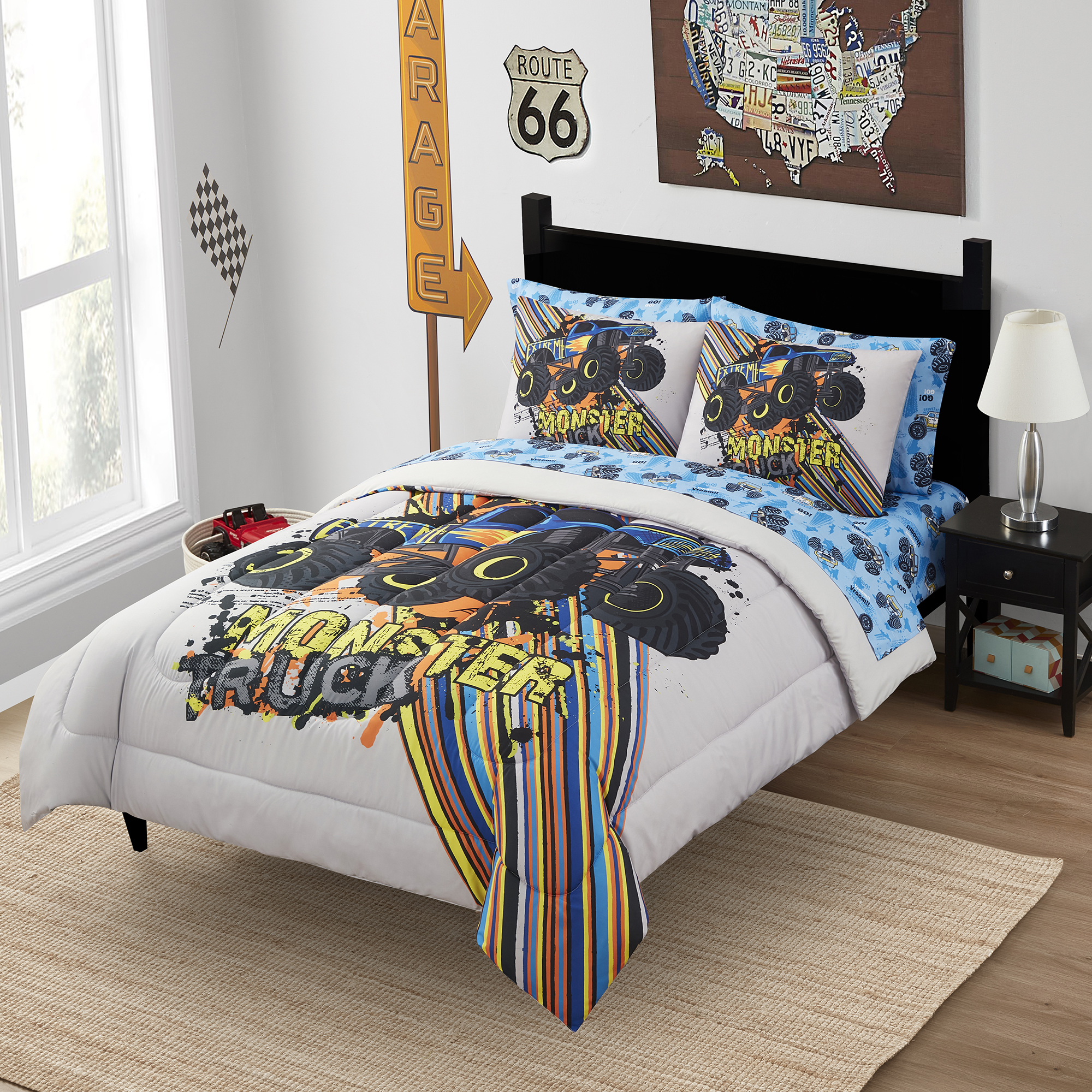 Kids will dig our Monster Truck Comforter and Sheet Set. Featuring a vibrantly colored Monster Truck design and double brushed microfiber construction, they’ll love to sleep in this ultra soft Monster Truck comforter and sheet set. With the set you will get a 100% Polyester Microfiber & Down Alternative Colorful truck print comforter with matching pillow shams, and a gorgeous blue sheet set with monster trucks that will dress up your childs bed without breaking the bank.