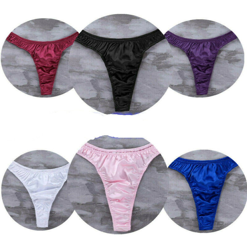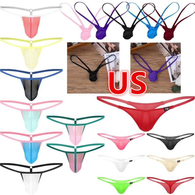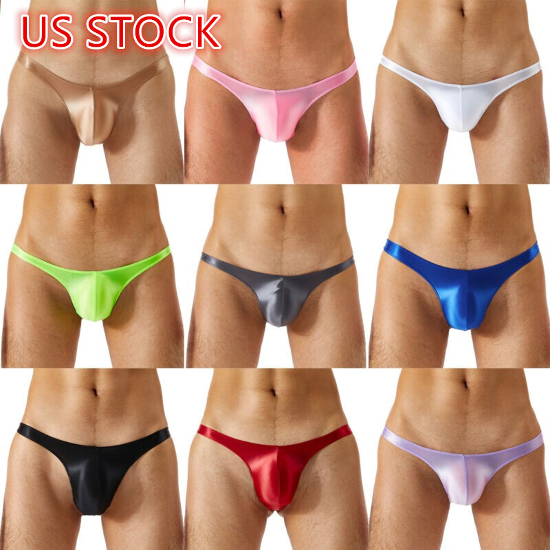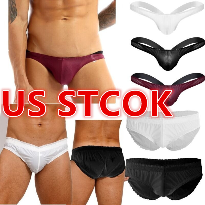 Removable bulge pouch, open butt, low waist with comfy elastic waistband, glossy appearance.