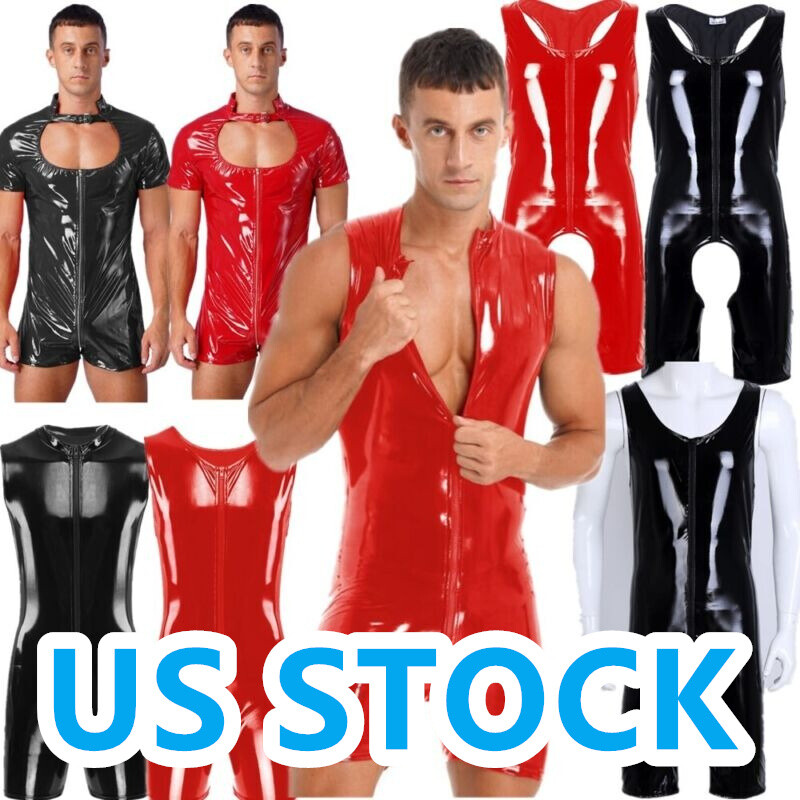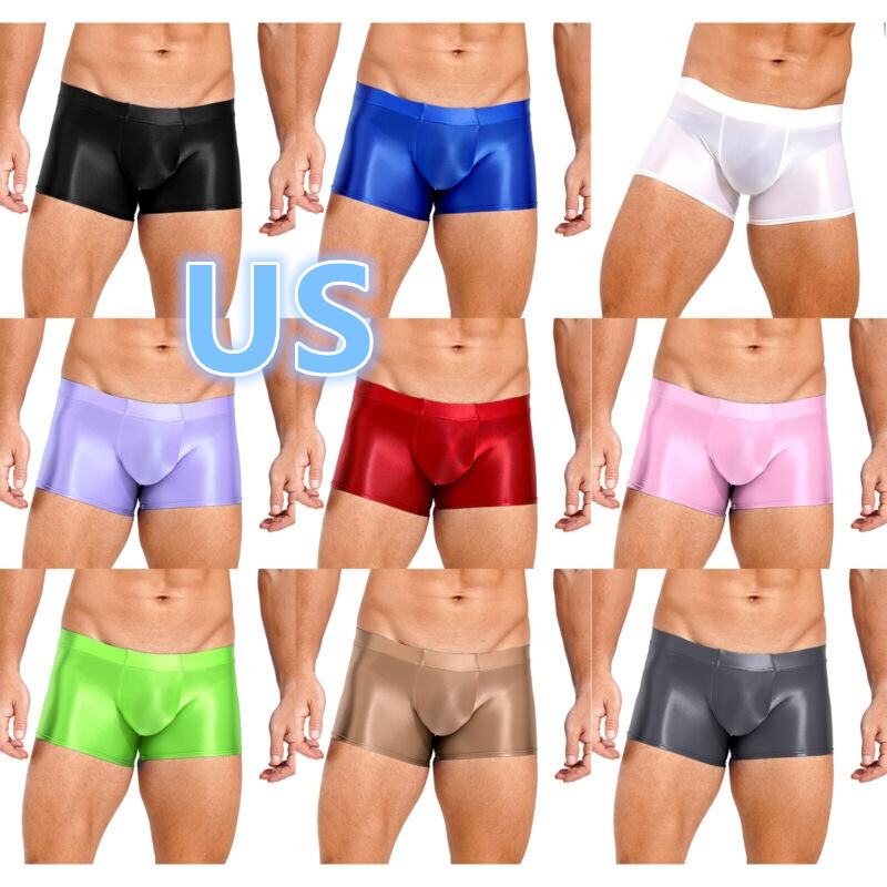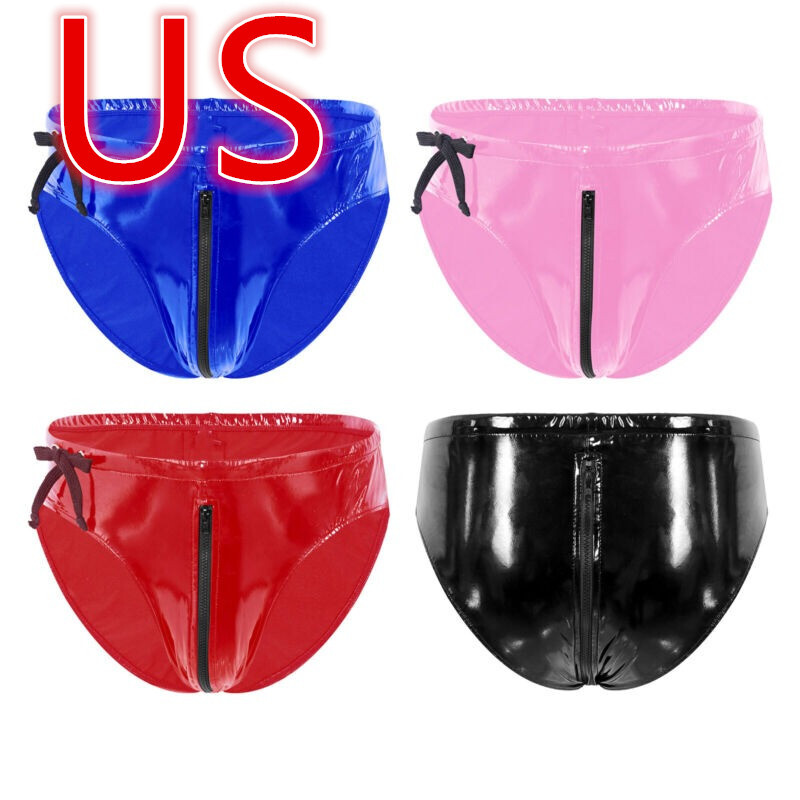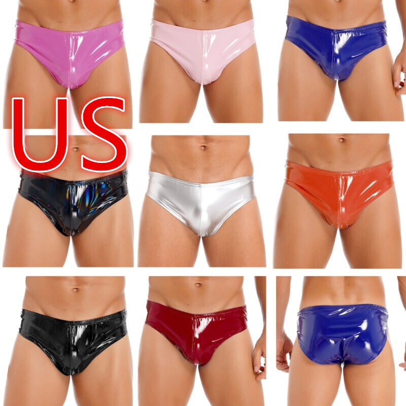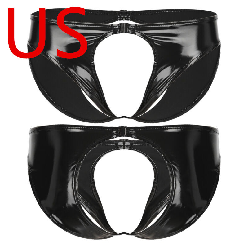Men Wet Look Patent Leather Low Waist Boxer Briefs Underwear Open Butt Removable Bulge Pouch Shorts.