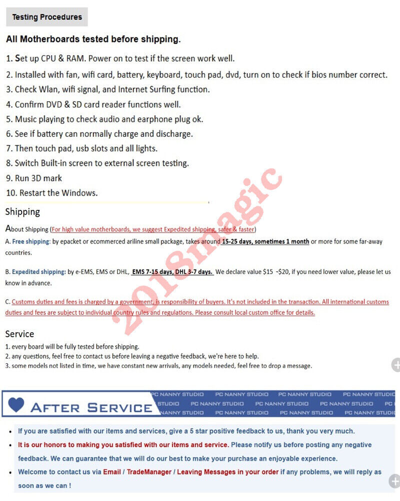 Our motherboard must pass the full function test again before sending.We will send the item after your payment within 3 days and provide a tracking number for you(Under $ 10 does not track single number).