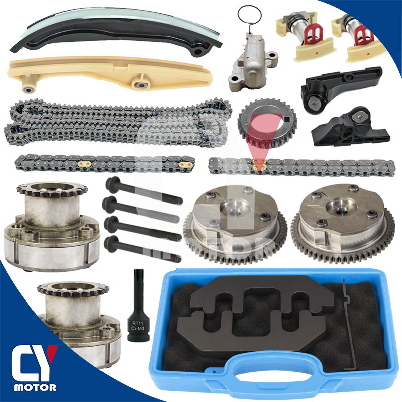 Kit De Cadena De Distribucion / Timing Chain Kit:Cadena De Distribución / Primary Timing Chain (254 Link - Silent Type) x 1 PCSCadena De Distribución / Secondary Timing Chain (50 Link - Roller Type) x 2 PCSEngrane De / Rueda De Espigas / Crankshaft Gear (29 Teeth) x 1 PCSGuía / Timing Guide (Lower, Left) x 1 PCSGuía / Timing Guide (Lower, Right) x1 PCSGuía / Timing Guide (Upper) x 1 PCSGuía / Timing Guide (Lower) x 1 PCSTensor / Primary Timing Chain Tensioner x 1 PCSTensor / Secondary Timing Chain Tensioner x 2 PCSTiming Chain Tensioner Arm X 2 PCSEngrane De VVT / Rueda De Espigas / Cam Gears / VVT Cam Sprocket Exhaust x 2 PCSEngrane De VVT / Rueda De Espigas / Cam Gears / VVT Cam Sprocket Intake x 2 PCSBolt x 4 PCSHerramientas De Distribucion / Timing Alignment Hold Tool:567618 Ford Camshaft Holding Tool X 2 PCS