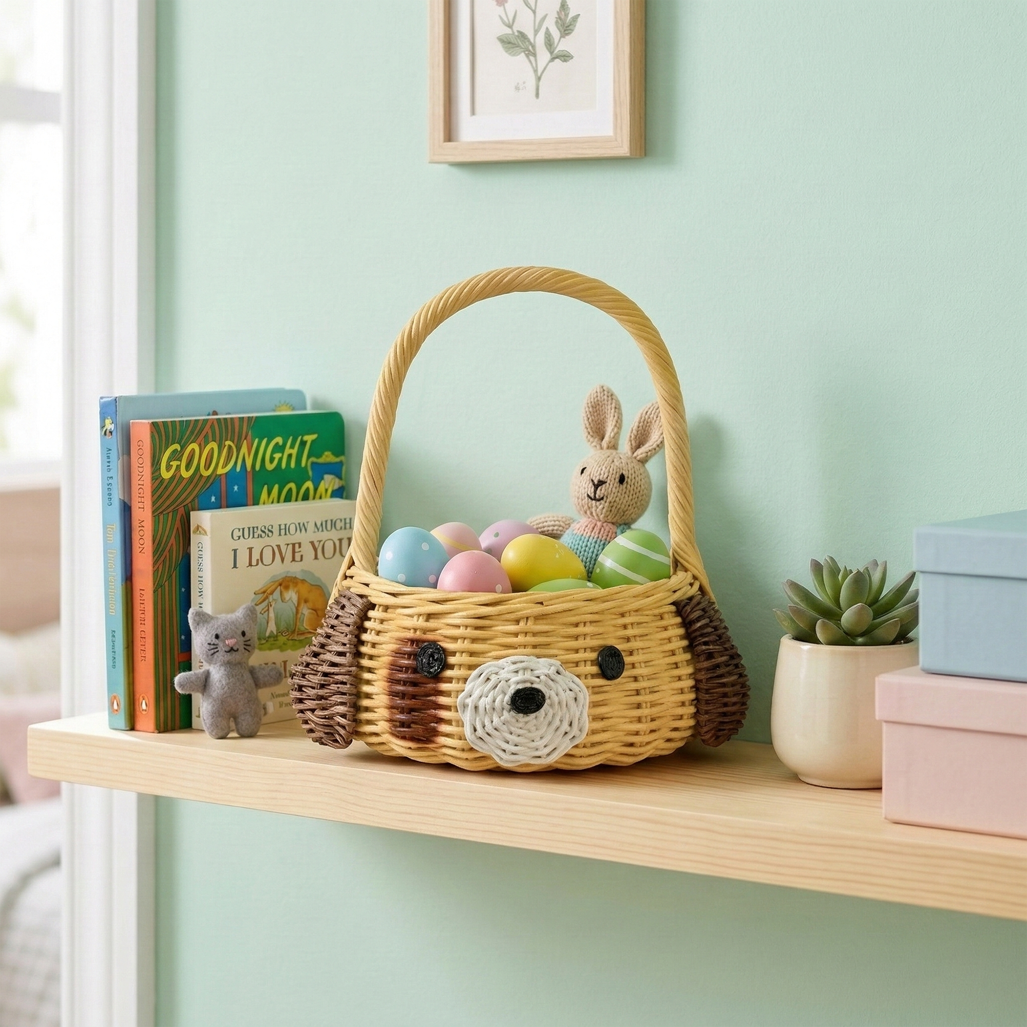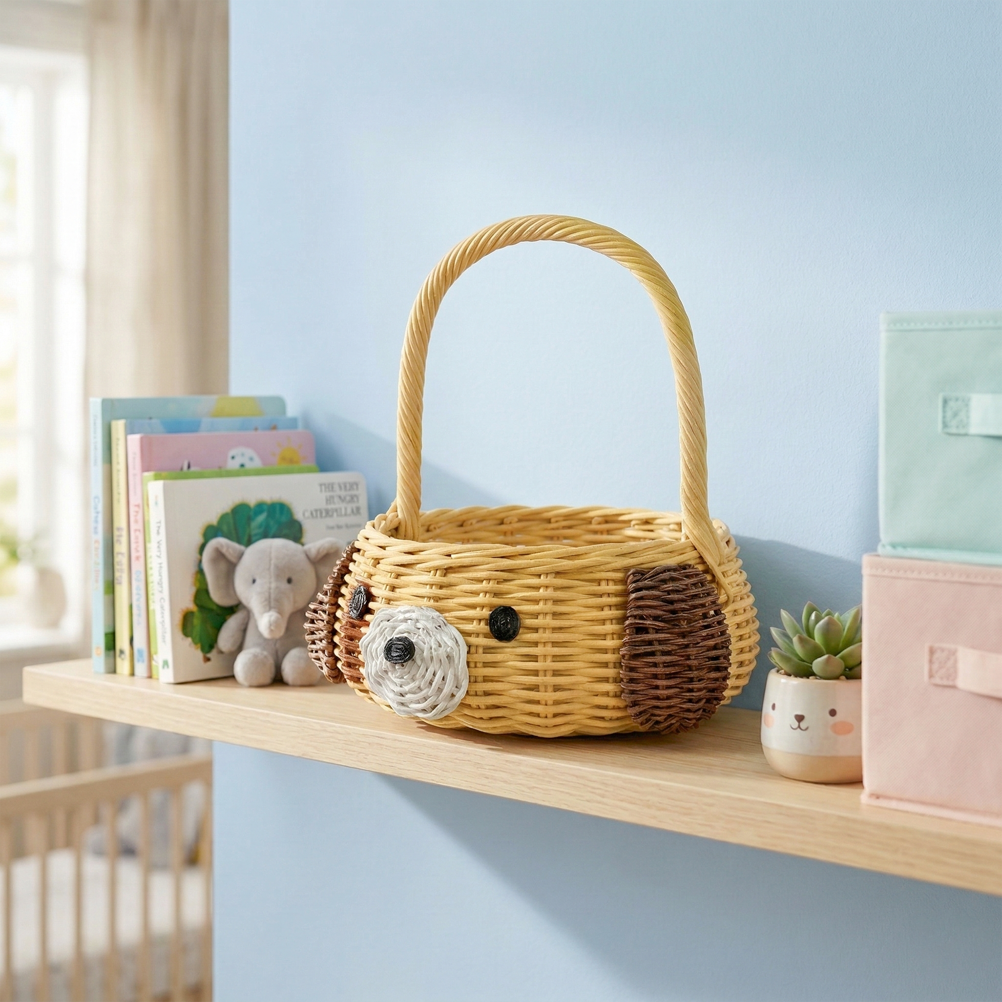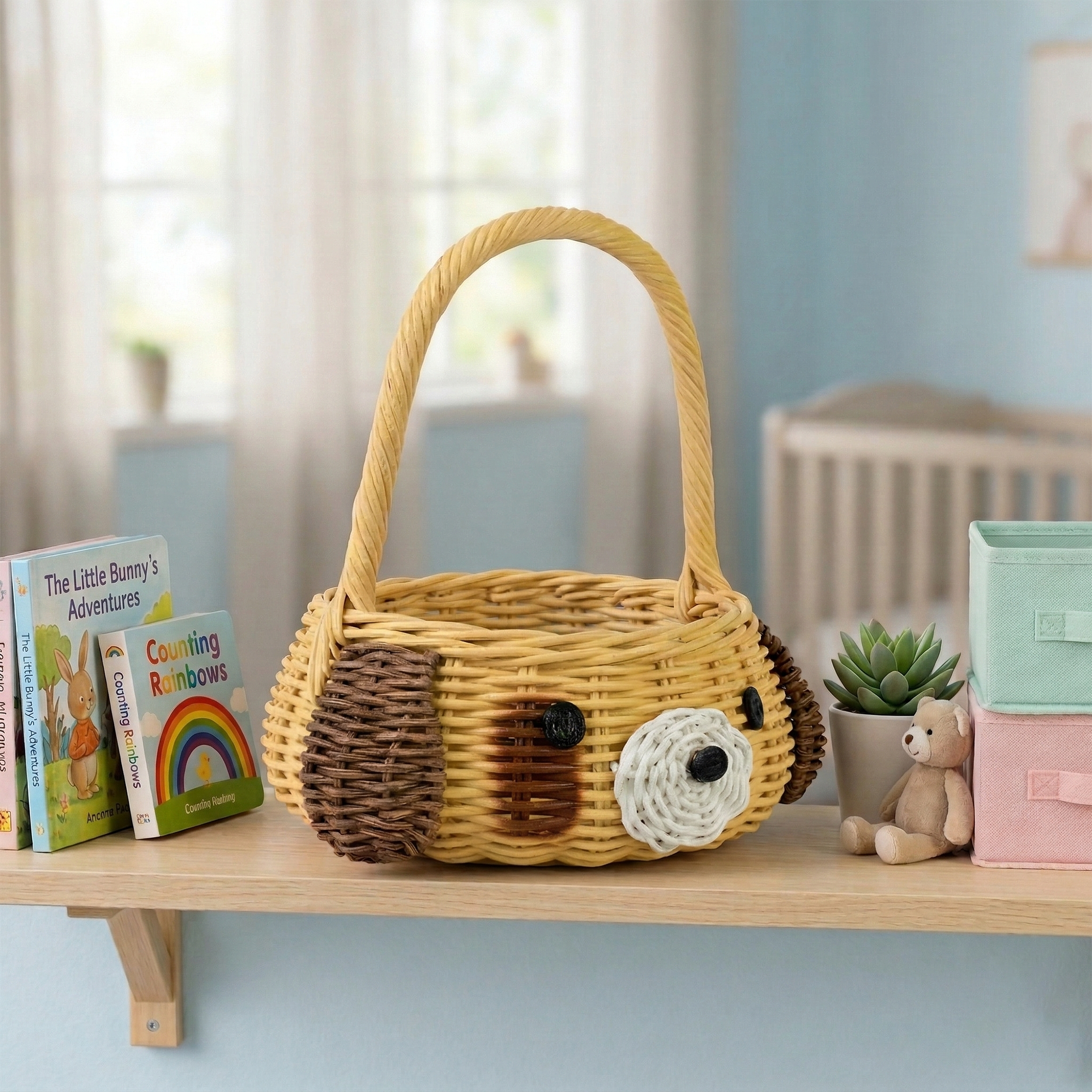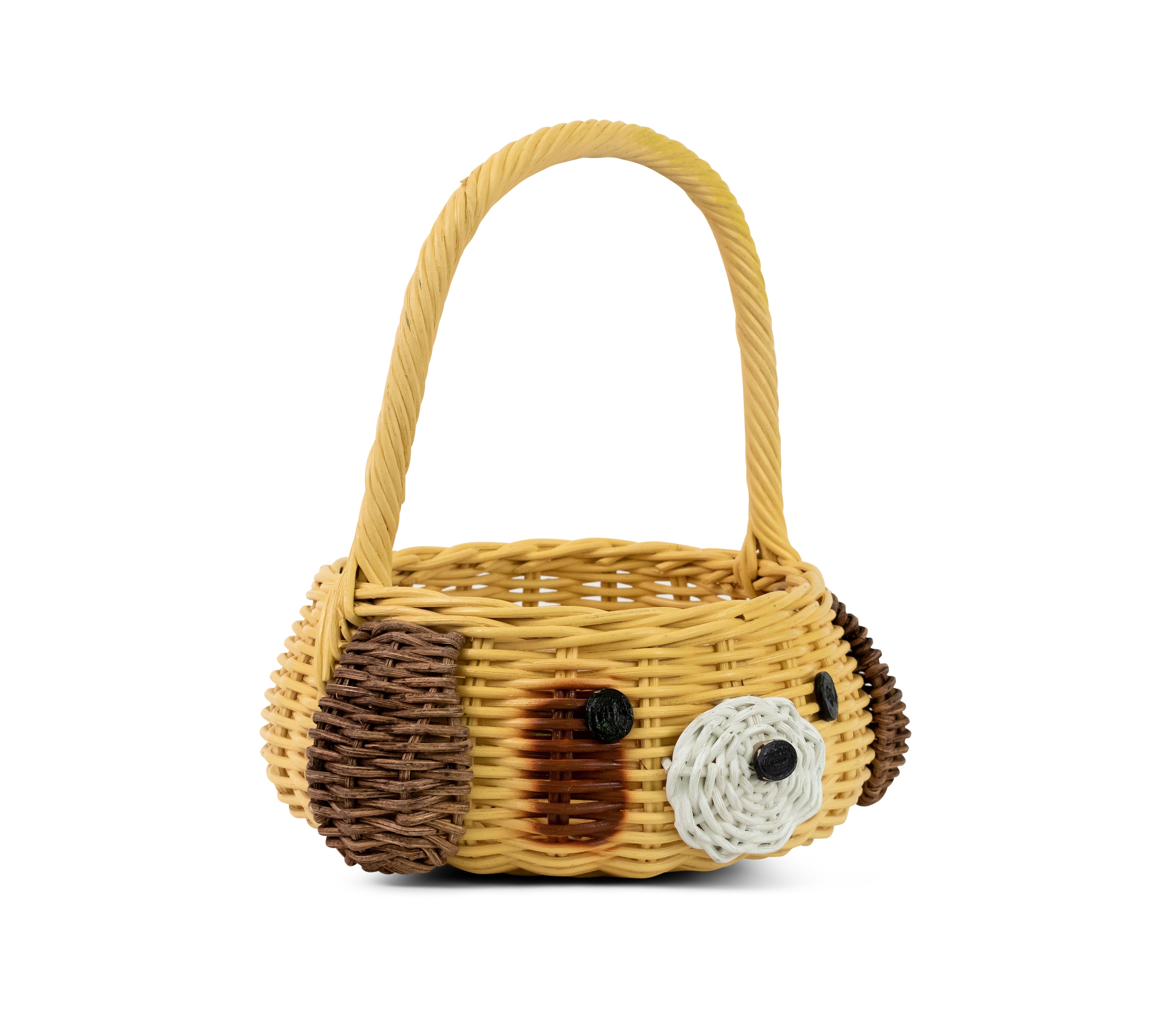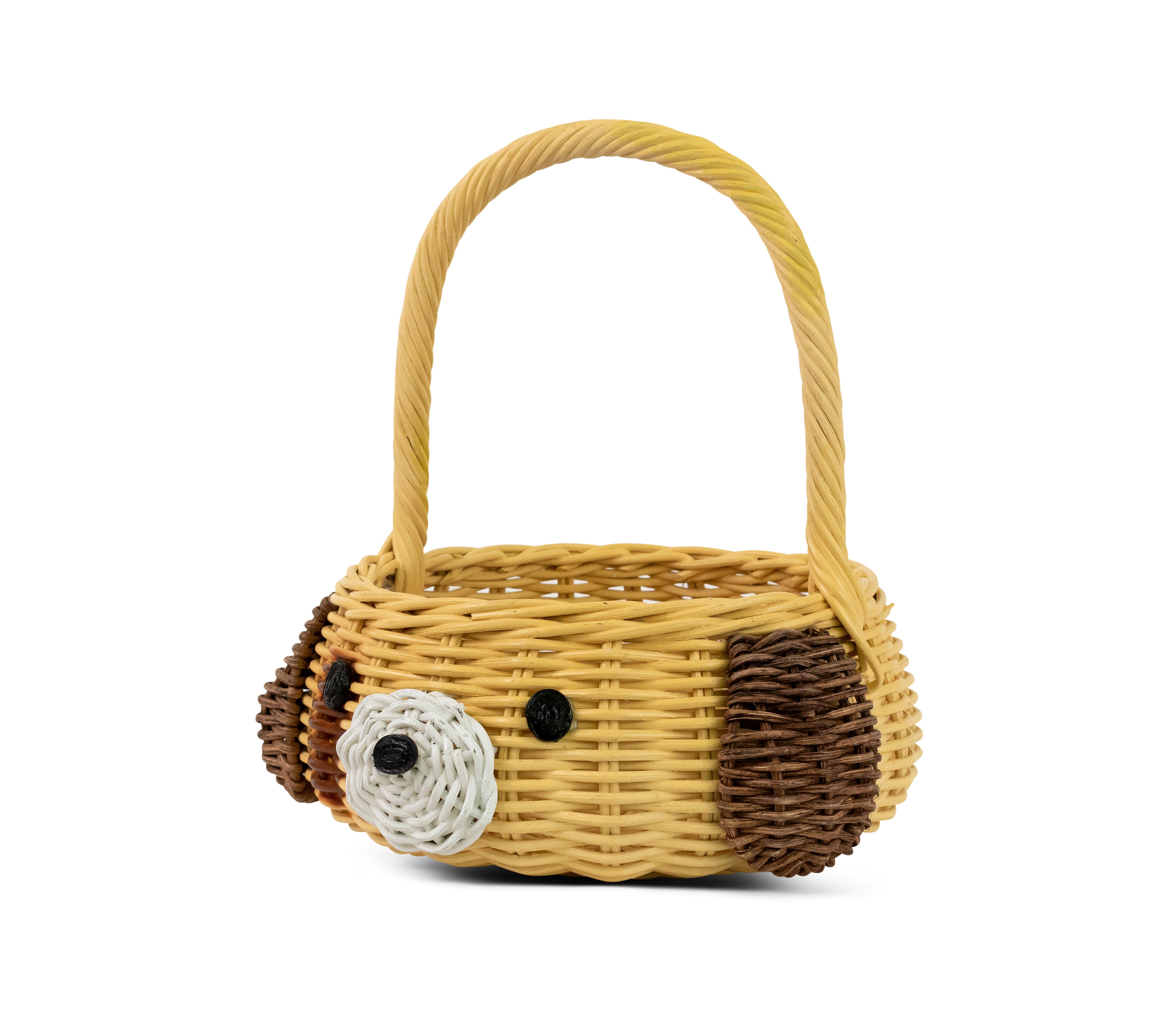 A real top dog, this handwoven wicker basket has been detailed with hand for carrying and a cute puppy face. Assembled by hand using natural rattan in shades of brown, white and yellow, the basket is a handcrafted piece often used for storage in pet rooms, classrooms or baby nurseries.