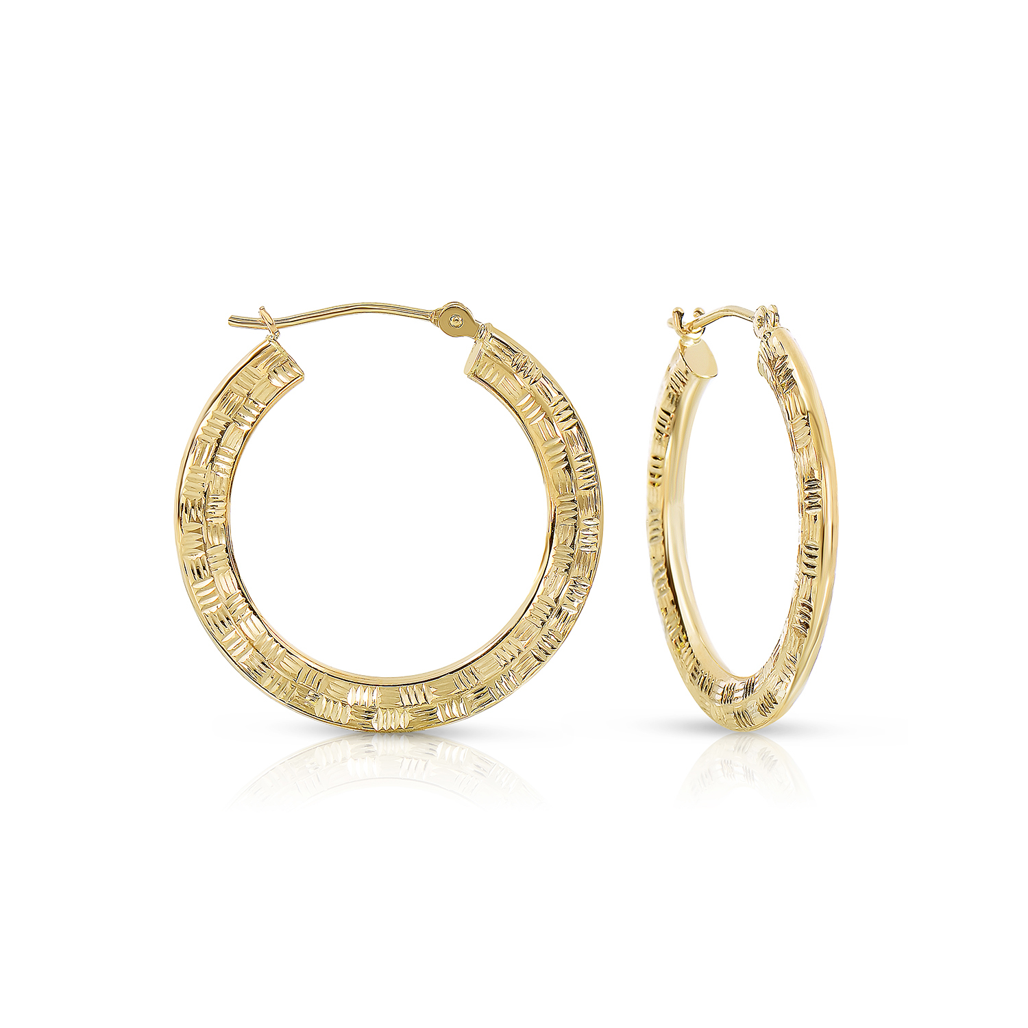 TILO Jewelry 14K Real Solid Yellow Gold Checkered Textured Diamond-cut Round Flat Hoop Earrings 20mm-35mm Hand Engraved Round Chunky Hoop Ring Earrings Women, Girls, Unisex