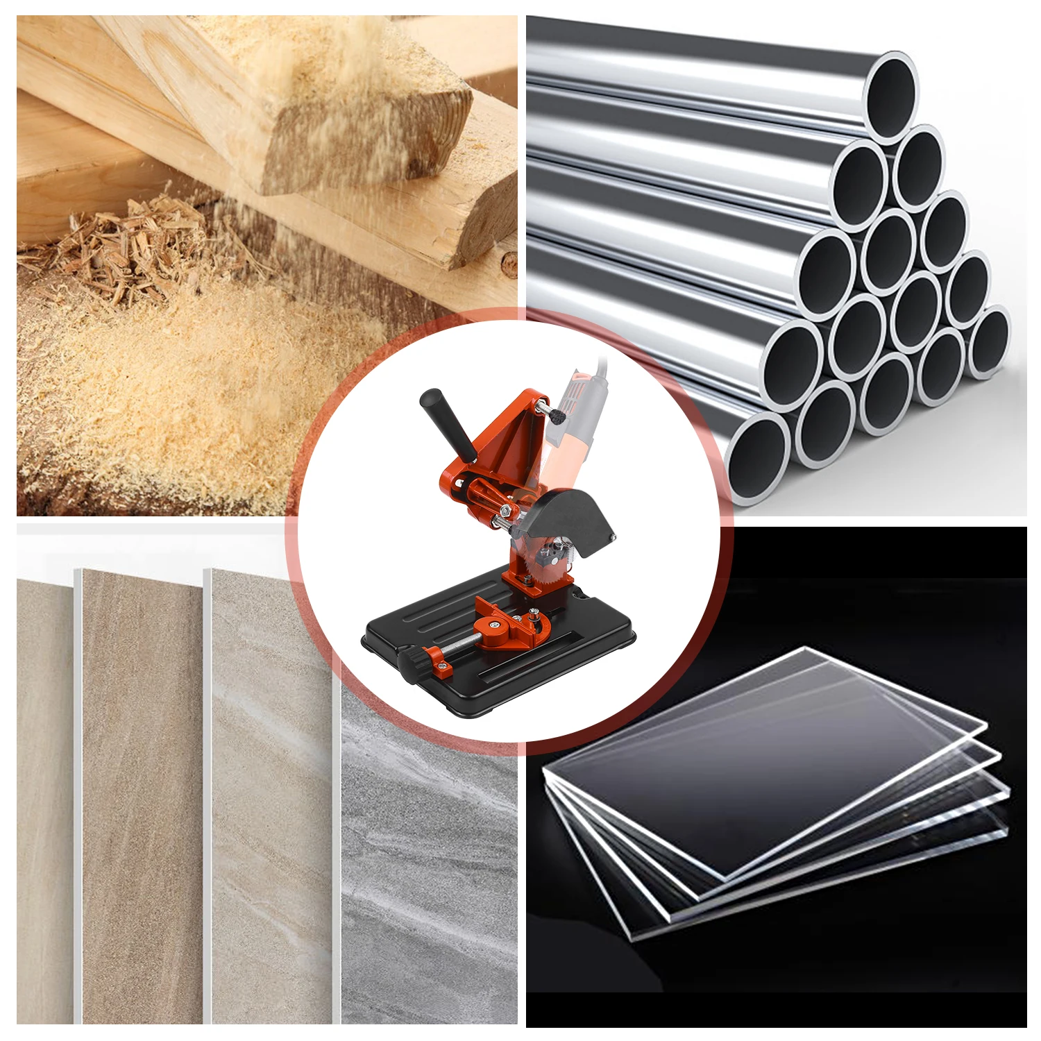 Specification: Name: Angle Grinder Stand Material: Aluminum Alloy Color: Orange + Black Maximum Grip Width: 90mm Adjustable Angle: 0-45° Cutting Depth: 30mm Application: for 100/115/125mm Angle Grinder After Installation Size: 250x200x300mm