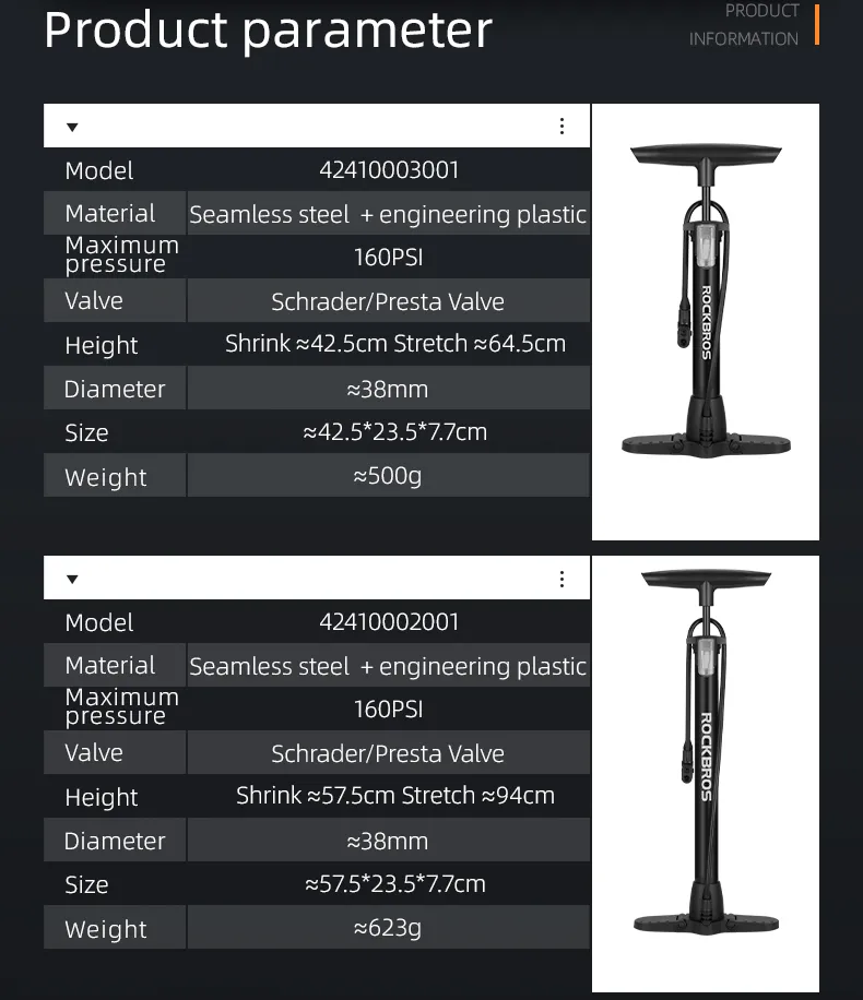 42310002001 Material : Aluminum alloy + engineering plastic /Pressure: 160PSI/ Valve: Schrader/Presta Valve Height : Shrink ≈66cm Stretch ≈110cm /Diameter: ≈ 32mm /Size:≈66*23*11cm Weight: ≈972g