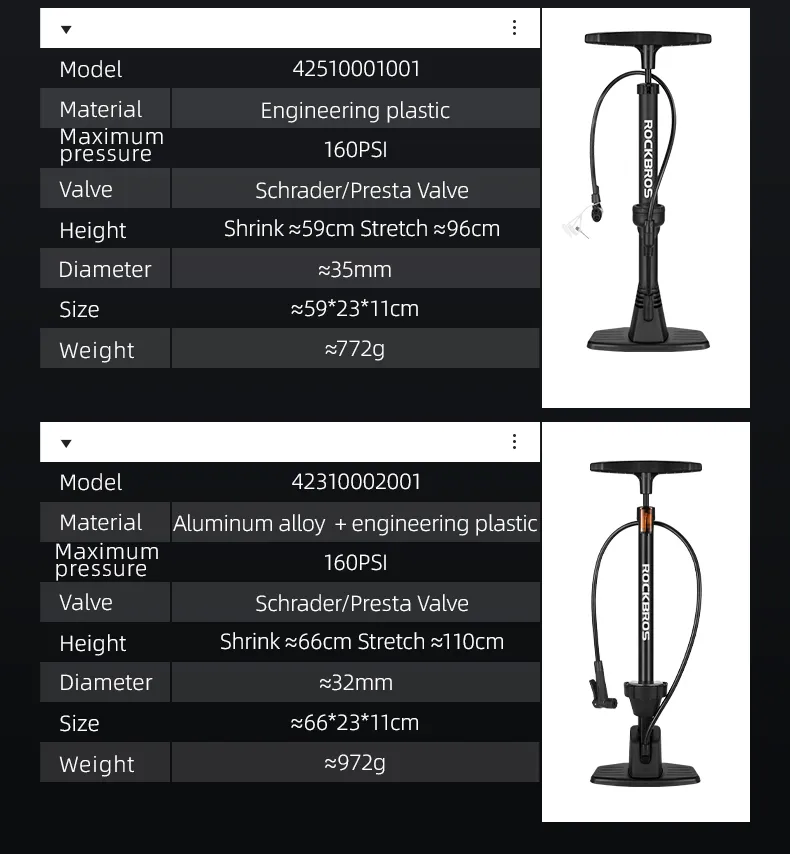 42510001001 Material : Engineering plastic /Pressure: 160PSI/ Valve: Schrader/Presta Valve Height : Shrink ≈59cm Stretch ≈96cm /Diameter: ≈ 35mm /Size:≈59*23*11cm Weight: ≈772g