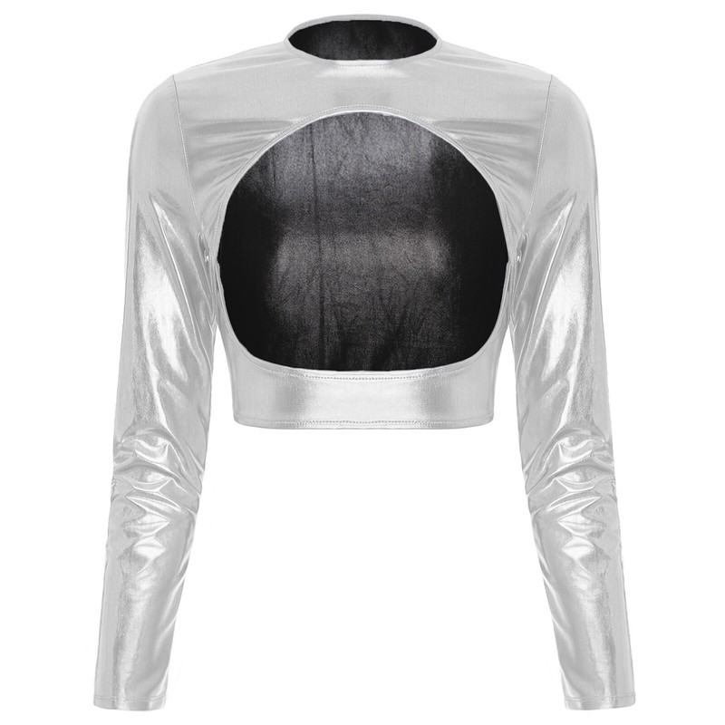 Womens Top Party Tee Long Sleeve Shirt Shiny Crop Top Cut Out Leather PVC Rave
